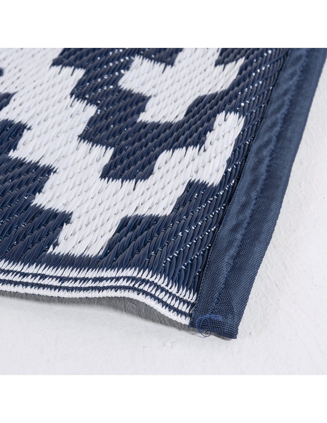 Tu set de exterior lucirá precioso sobre la alfombra de exterior Prime de color blanco y azul oscuro .
