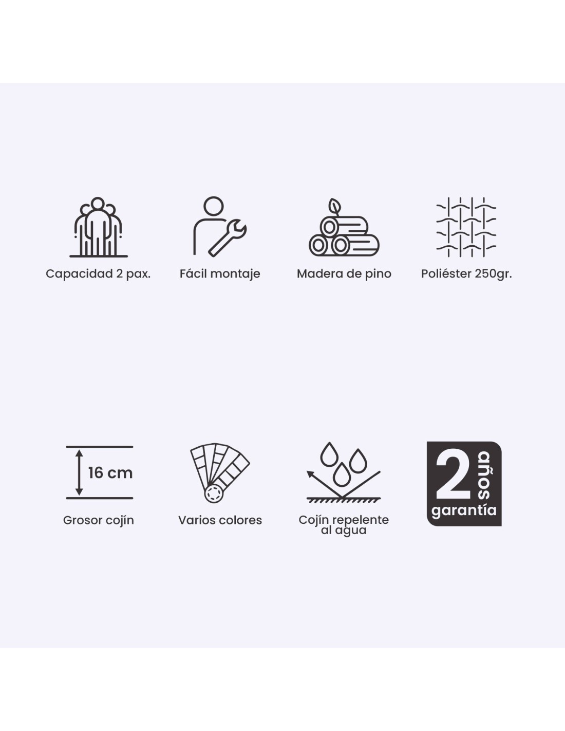 Cojín asiento con medidas de 80x120x16 cm y cojín respaldo de 42x120x16 cm, fabricados con tejido que repele el agua y gramaje de 180 gr.