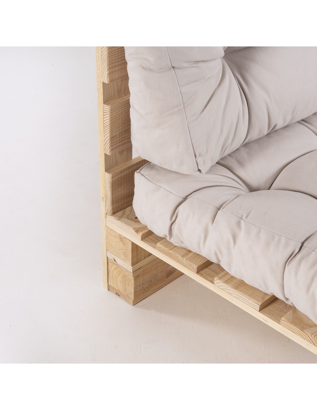 Sofás de palets madera de pino de primer uso y cojines de asiento y respaldo en color crudo, aptos para interior y exterior.