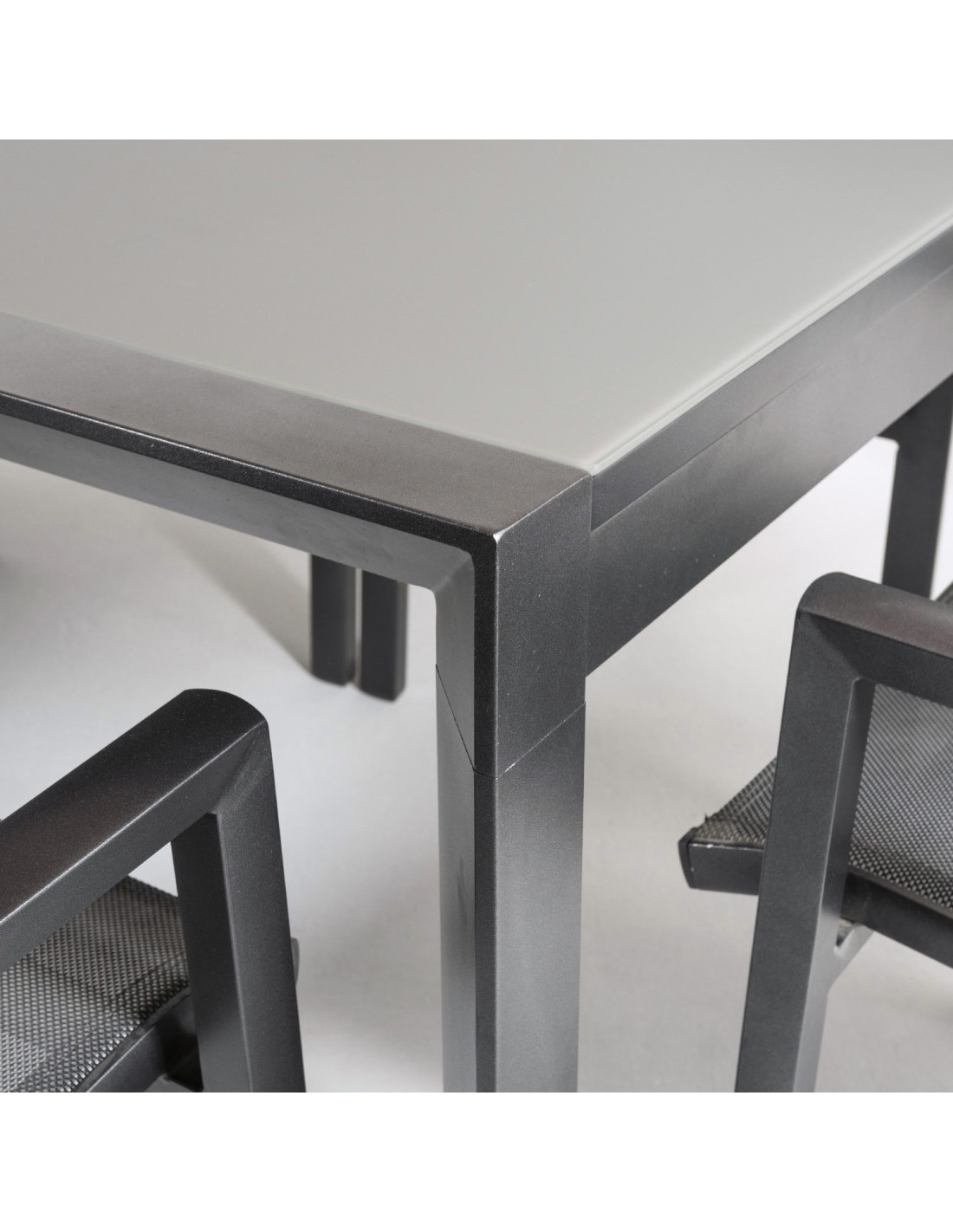 Mesa de jardín realizada con estructura de aluminio en color antracita y tablero de cristal mate en color taupé.