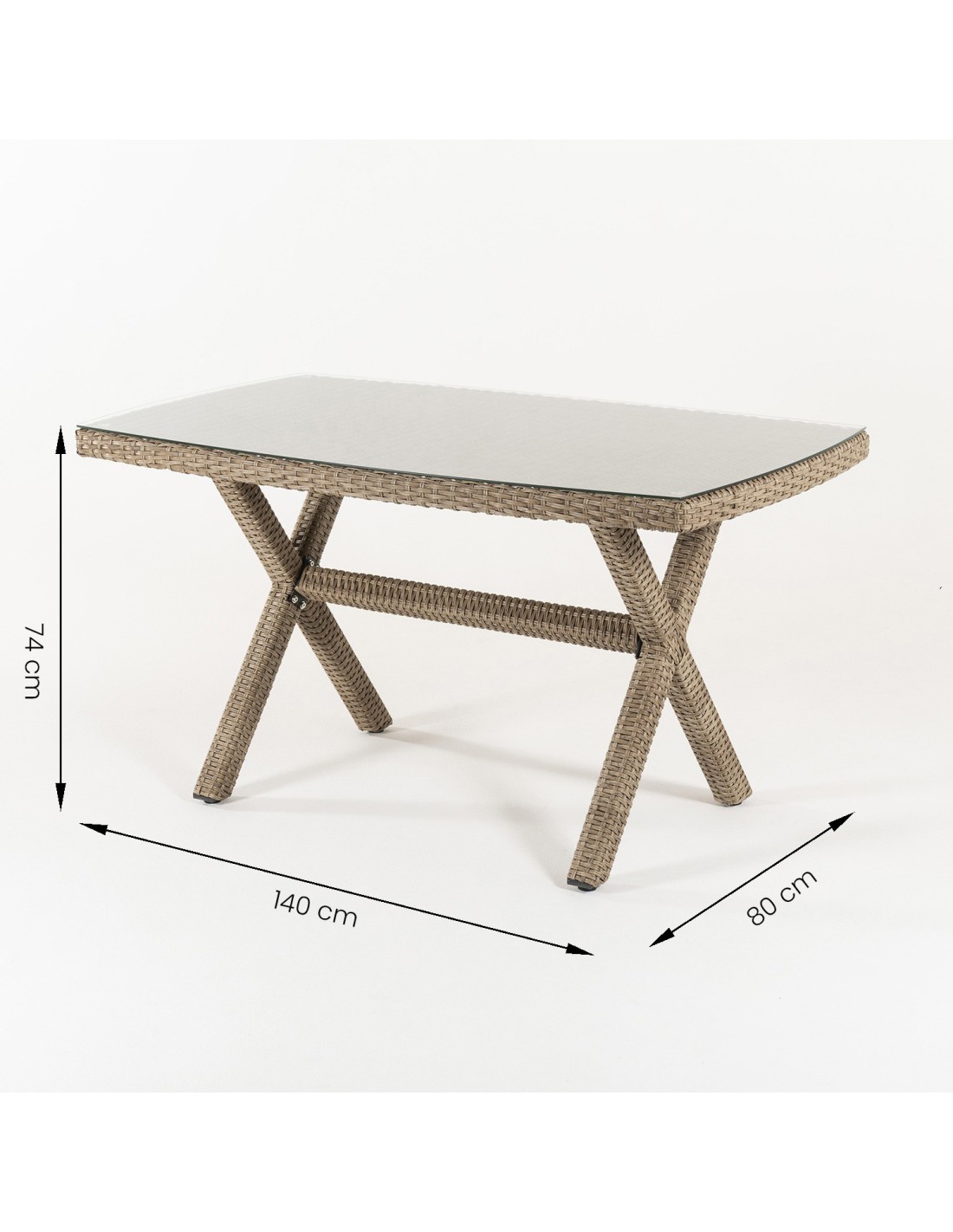 Mesa exterior con cristal transparente de 5 mm de grosor, gran grosor que nos proporciona un cristal fuerte y resistente. Además, este cristal tiene una protección adicional que protege la fibra, que evita el efecto lupa y no deja pasar el calor de los rayos de sol evitando un efecto invernadero que puede deteriorar la fibra.