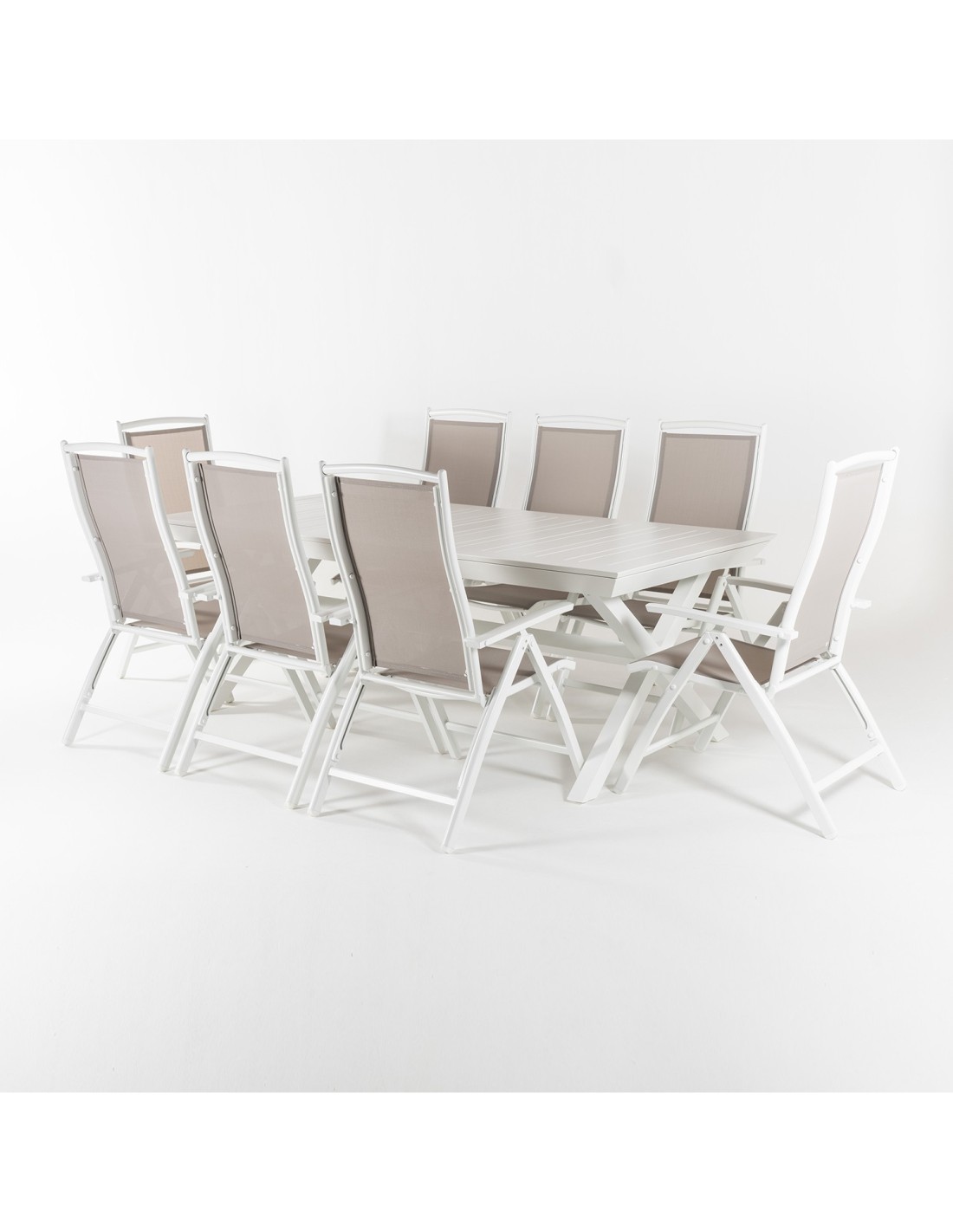 Conjunto de exterior de mesa rectangular extensible y 8 sillones reclinables y plegables. Mesa de aluminio con tablero y patas en cruz color Blanco, que le da un diseño elegante a la mesa.