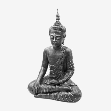 Figura buda en color plateado fabricada en piedra y fibra de vidrio, en la que destacan con total precisión sus rasgos de cara, manos, pies, manto y expresión general del Buda durante la meditación.
