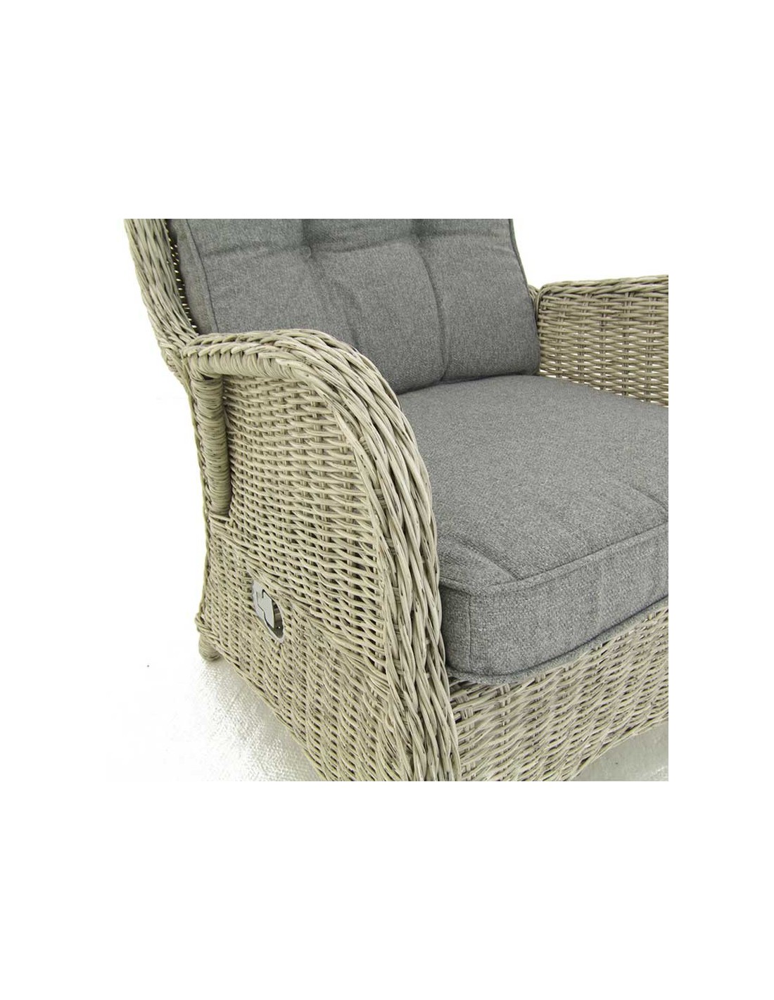 Sillón para jardín fabricado con estructura de aluminio y rattán sintético redondo en color blanco con aspecto envejecido.