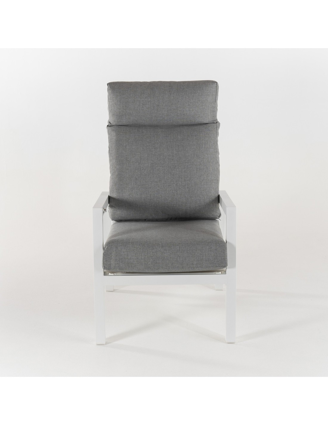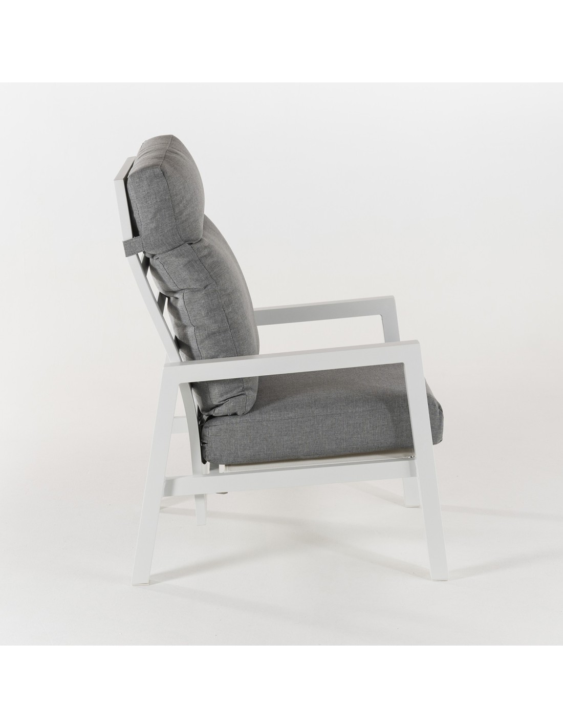 Fauteuil d'extérieur avec structure en aluminium anthracite et coussins gris épais.