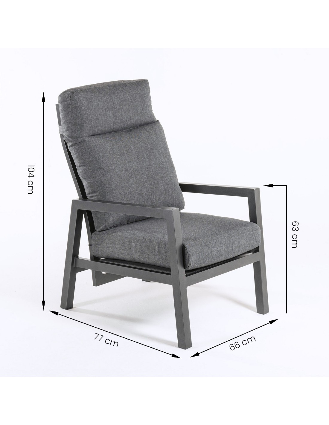 Fauteuils d'extérieur avec structure en aluminium de couleur anthracite et coussins épais gris foncé.