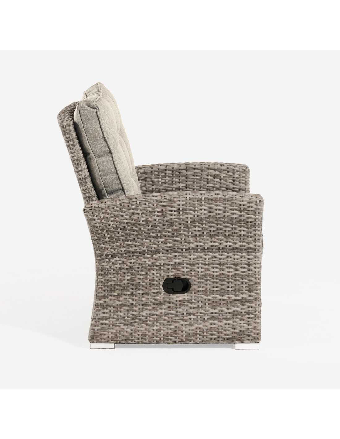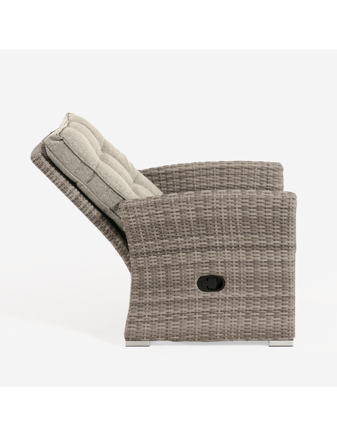 Fauteuil d'extérieur réalisé avec une structure en rotin synthétique plat et aluminium lourd à double articulation, de couleur marron tanné.