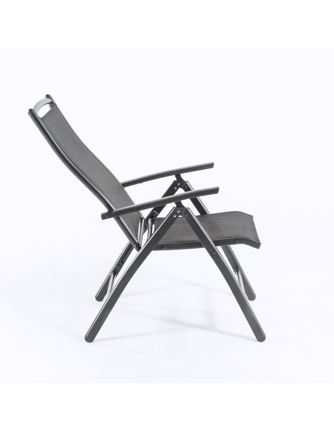 Fauteuil d'extérieur en structure en aluminium de couleur anthracite et textilène combinés en argent et noir.