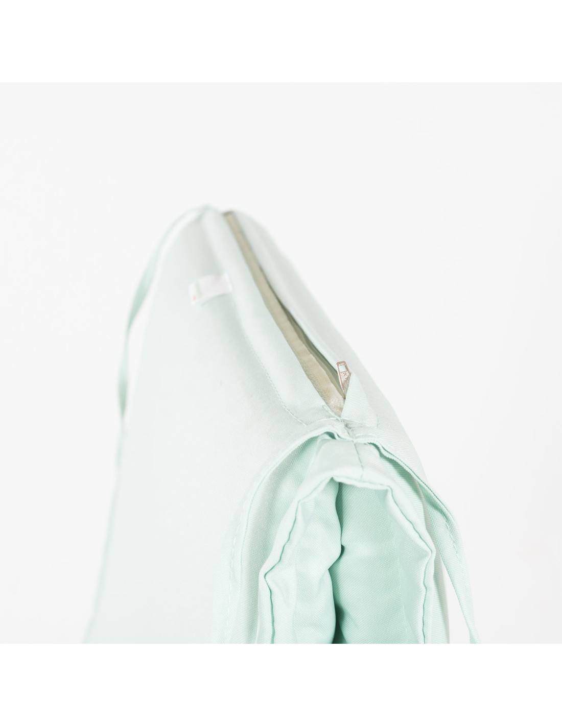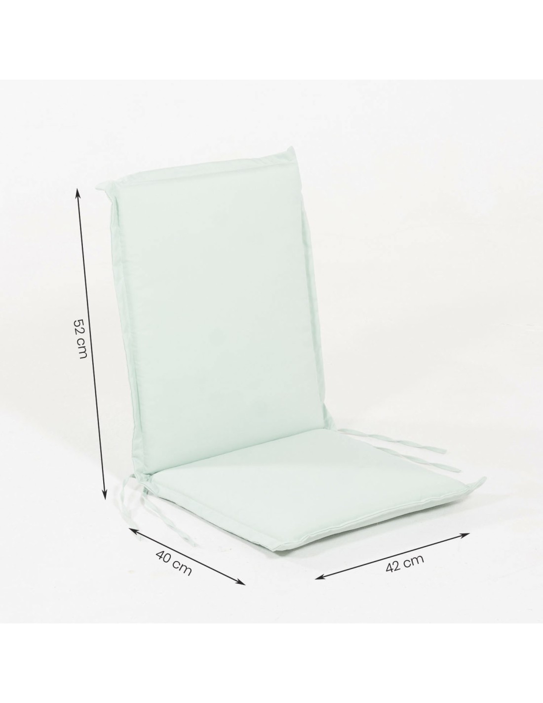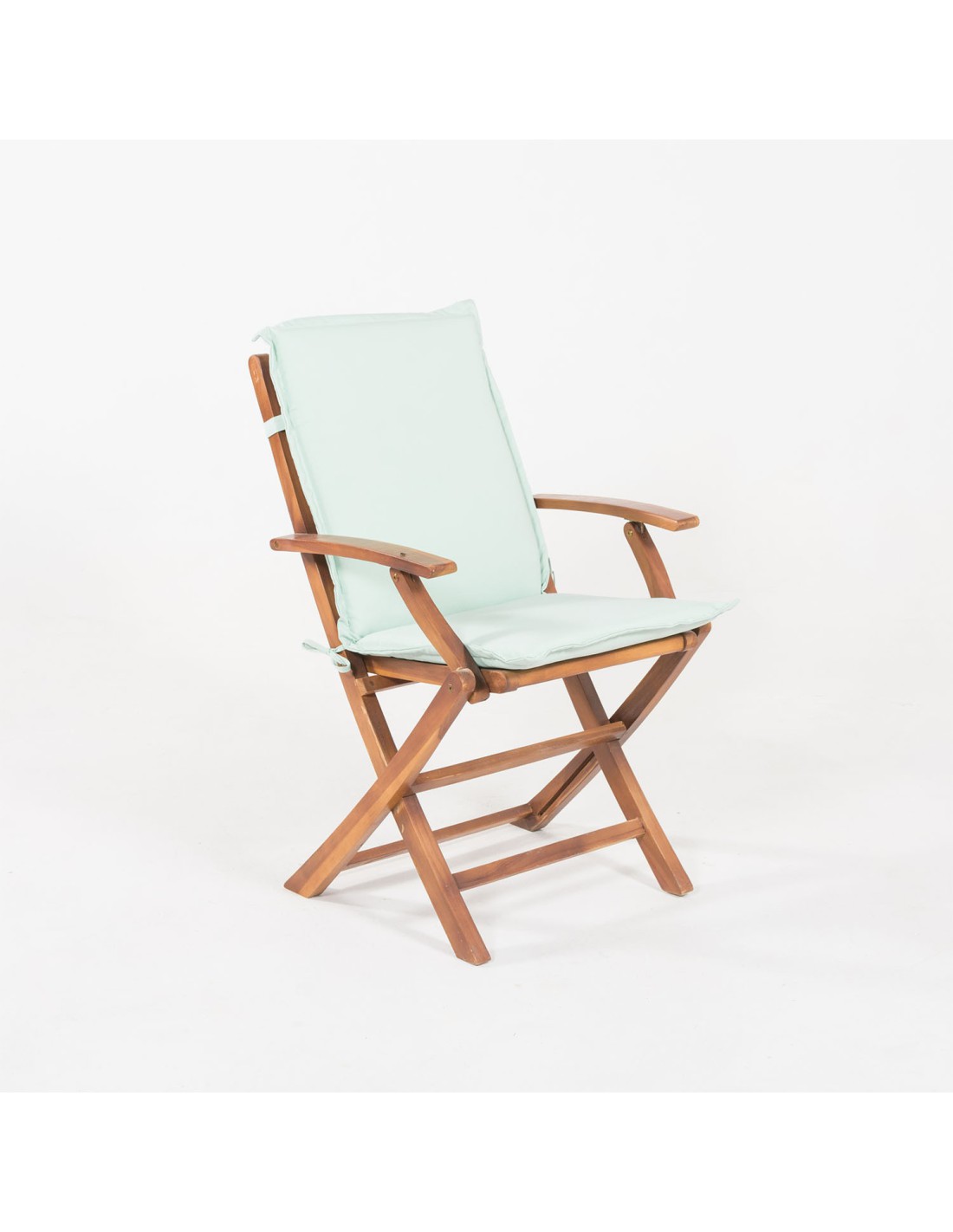 Coussin d'assise avec dossier, adapté aux chaises pliantes en teck d'extérieur en polyester 180 grammes avec tissu à double fil vert pastel. Ses dimensions sont de 92x42x4 cm, elles peuvent être utilisées avec nos chaises pliantes en teck avec ou sans accoudoirs.