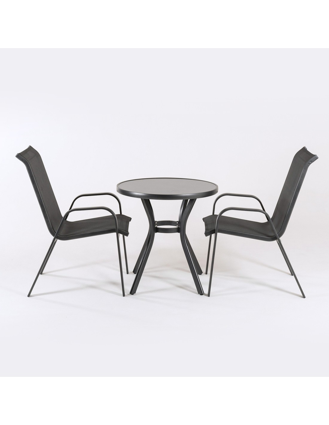 Ensemble balcon composé d'une table ronde 72 cm et de 2 fauteuils renforcés empilables.