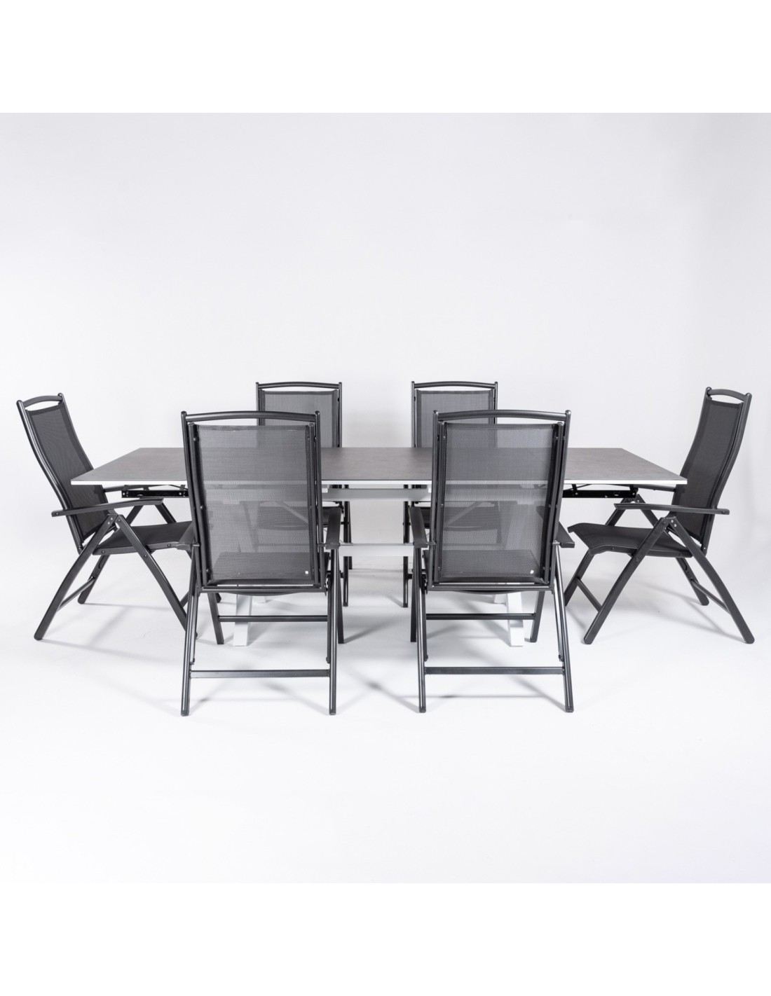 Conjunto de exterior de mesa extensible rectangular de 150 a 250 cm, tablero de cristal templado acabado en piedra con 6 sillones reclinables posiciones de aluminio color negro.