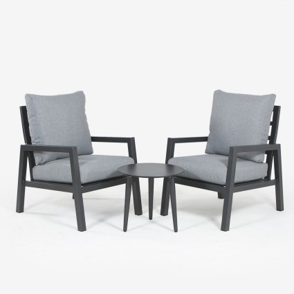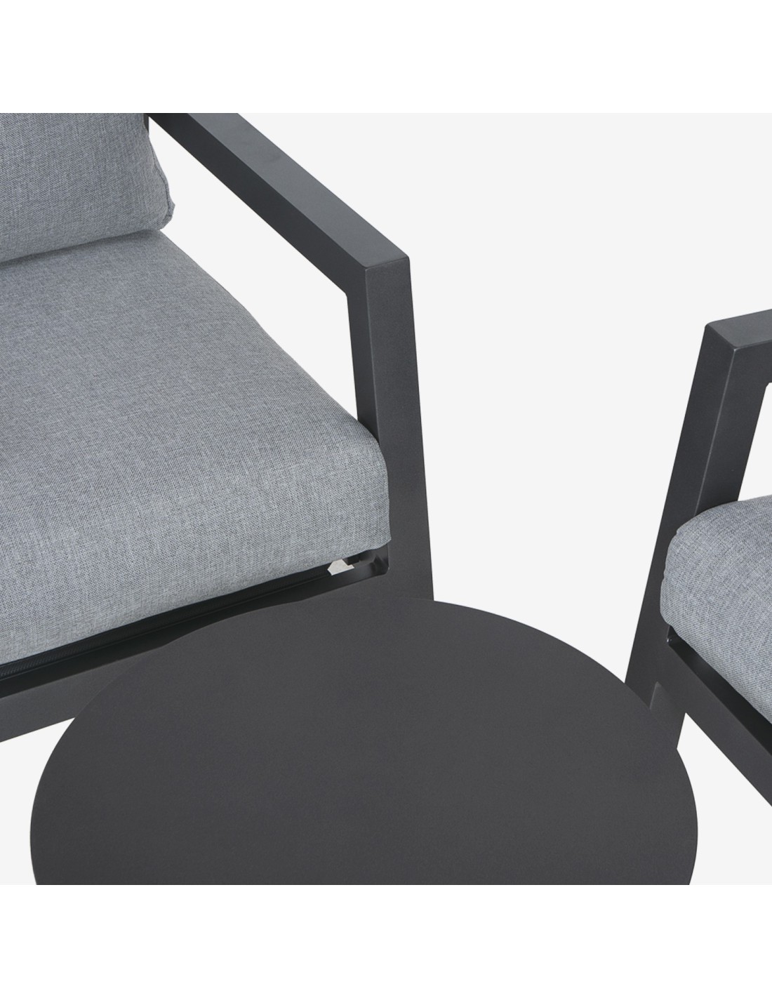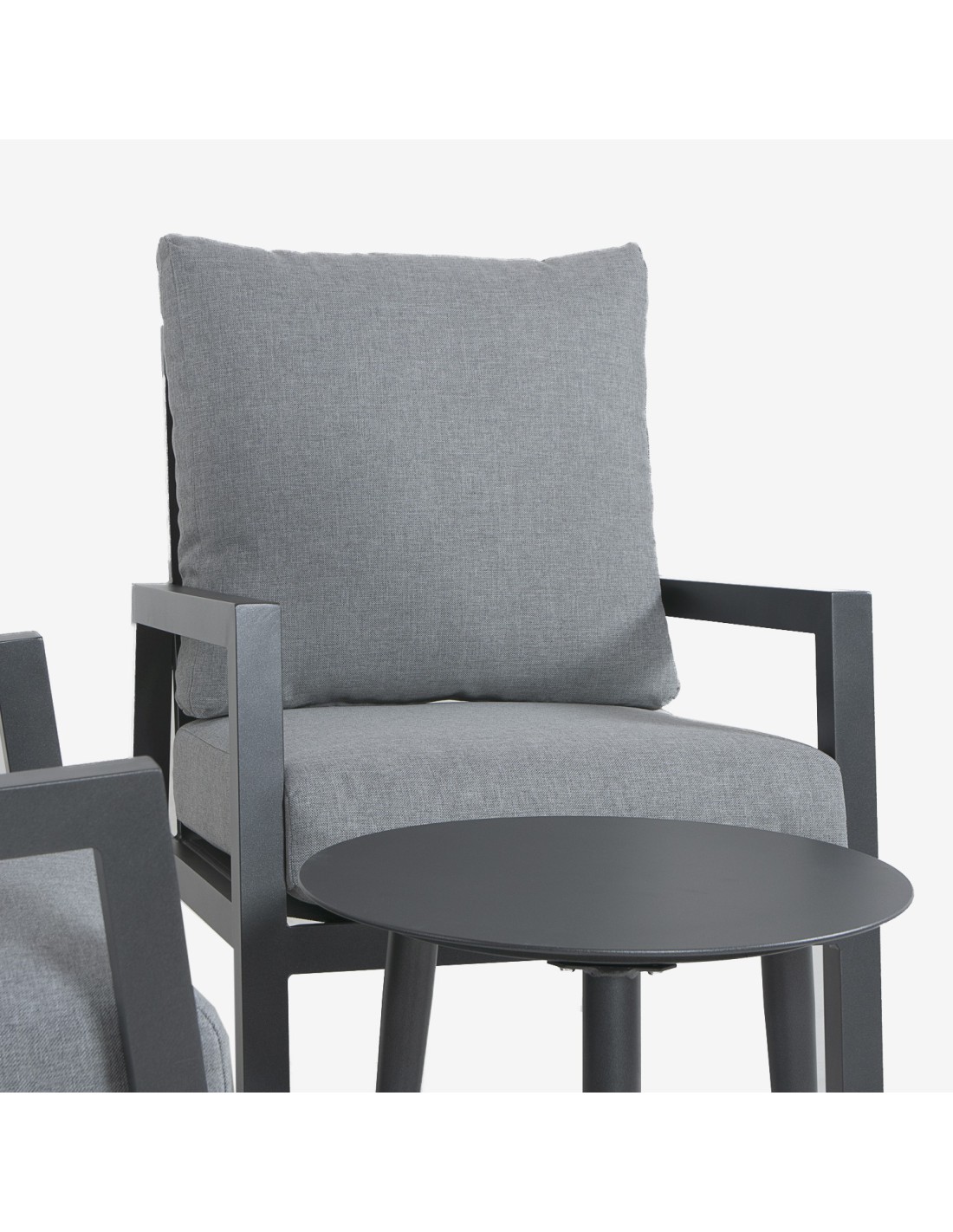 As < b>poltronas , fabricados em alumínio reforçado com parafusos inox e cor antracite, oferecem resistência e durabilidade, com design ergonômico que convida a relaxar e desfrutar do entorno. O alumínio é um material muito leve e com grande resistência às intempéries que não é afetado pela água ou umidade, um material muito adequado para ambientes externos.