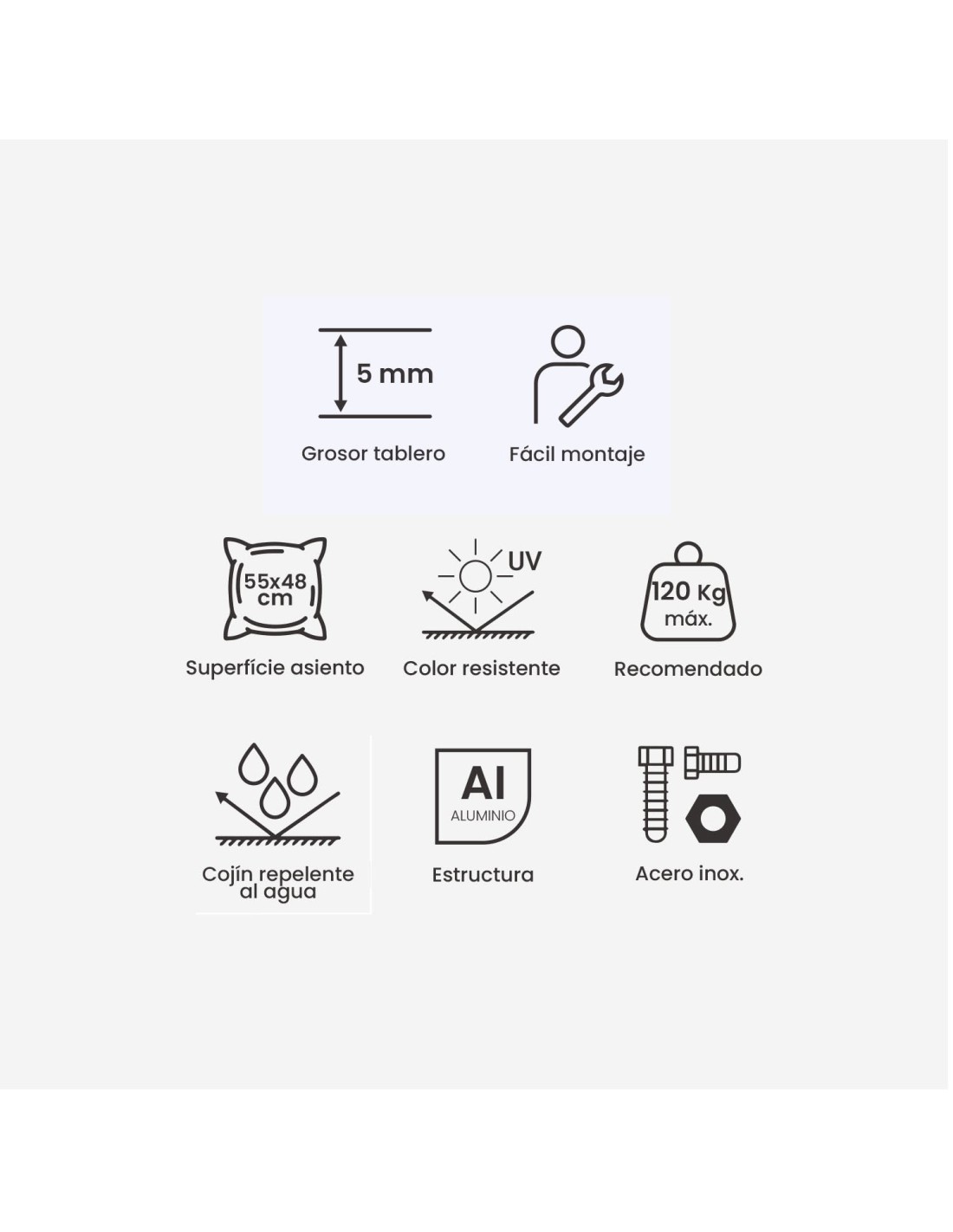 Almofadas cinza confeccionadas em poliéster de alta gramatura e agradável ao toque e tecido olefino que não descolora com a exposição ao sol e repele a água. Além disso, são removíveis para que possa lavá-los quando necessário, pelo que recomendamos utilizar um programa de lavagem para peças delicadas ou também à mão em água fria.