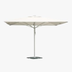 Parasol carré de 4,10x 4,10x 3,08 m de haut, en aluminium peint en blanc pour usage professionnel. Manche cannelé en aluminium en une seule pièce de 780 mm. et 2,5 mm d’épaisseur. 8 tiges en aluminium de 22 x 35 mm et 1,5 mm d’épaisseur. Injection d’aluminium et tapis. Tissu polyester de 300 g/m2, sans « rabat », avec cheminée. Protection UV. Idéal pour les jardins et terrasses.