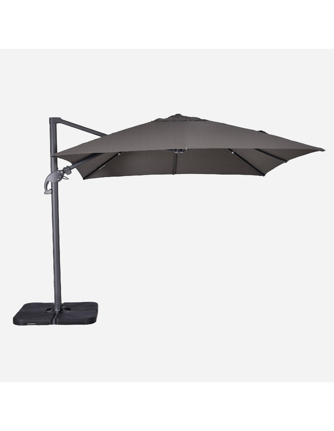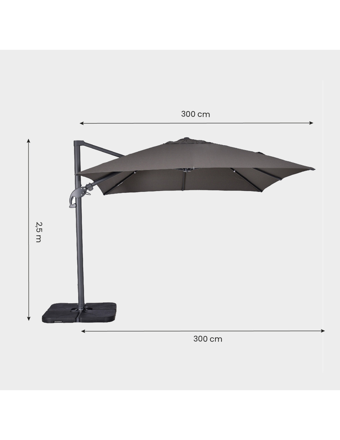 Le décor est complété par un système de rotation à 360° à la base, offrant une liberté totale de mouvement sans avoir besoin de déplacer le parasol.