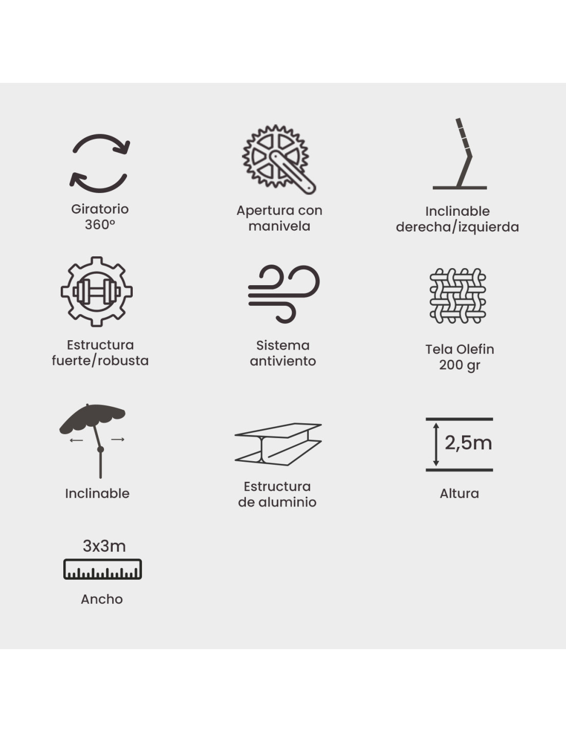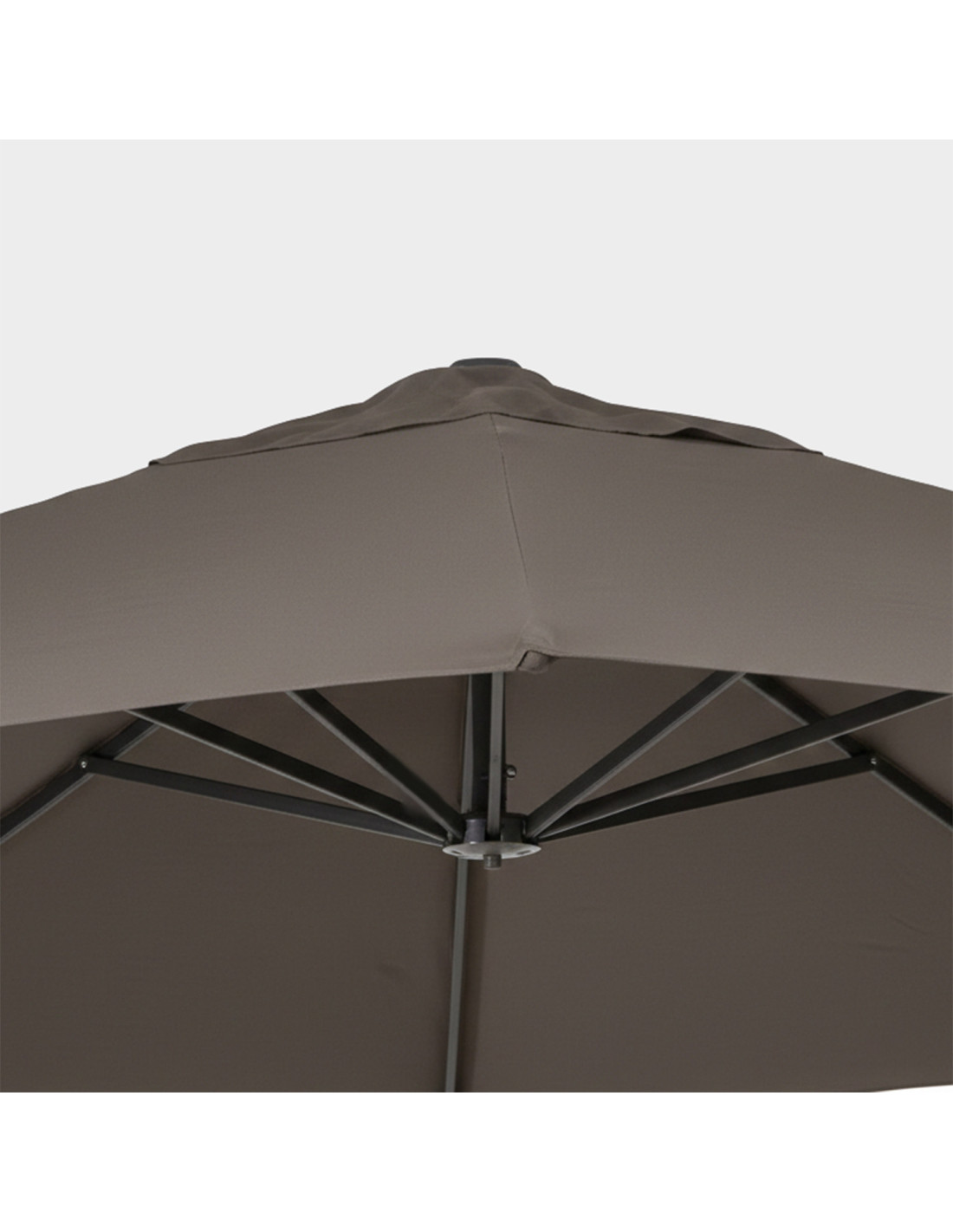 Le parasol comprend 8 tiges en aluminium renforcé mesurant 17x25 mm, conçues pour maintenir une bonne tension du tissu et assurer une répartition uniforme des teintes. La couverture est faite d’un tissu oléfine de 200 g/m² de couleur anthracite, un matériau technique particulièrement adapté à l’extérieur en raison de sa résistance, de sa stabilité des couleurs et de son toucher agréable.