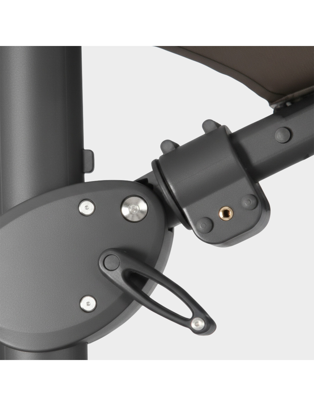 Grâce à une pédale d’action pratique située à la base, la pare-soleil peut tourner complètement sur son axe. D’une simple pression du pied, le système pivotant se libère et la pare-soleil s’oriente facilement dans toutes les directions. Lorsque la pédale est relâchée, elle est fermement verrouillée à la position souhaitée.