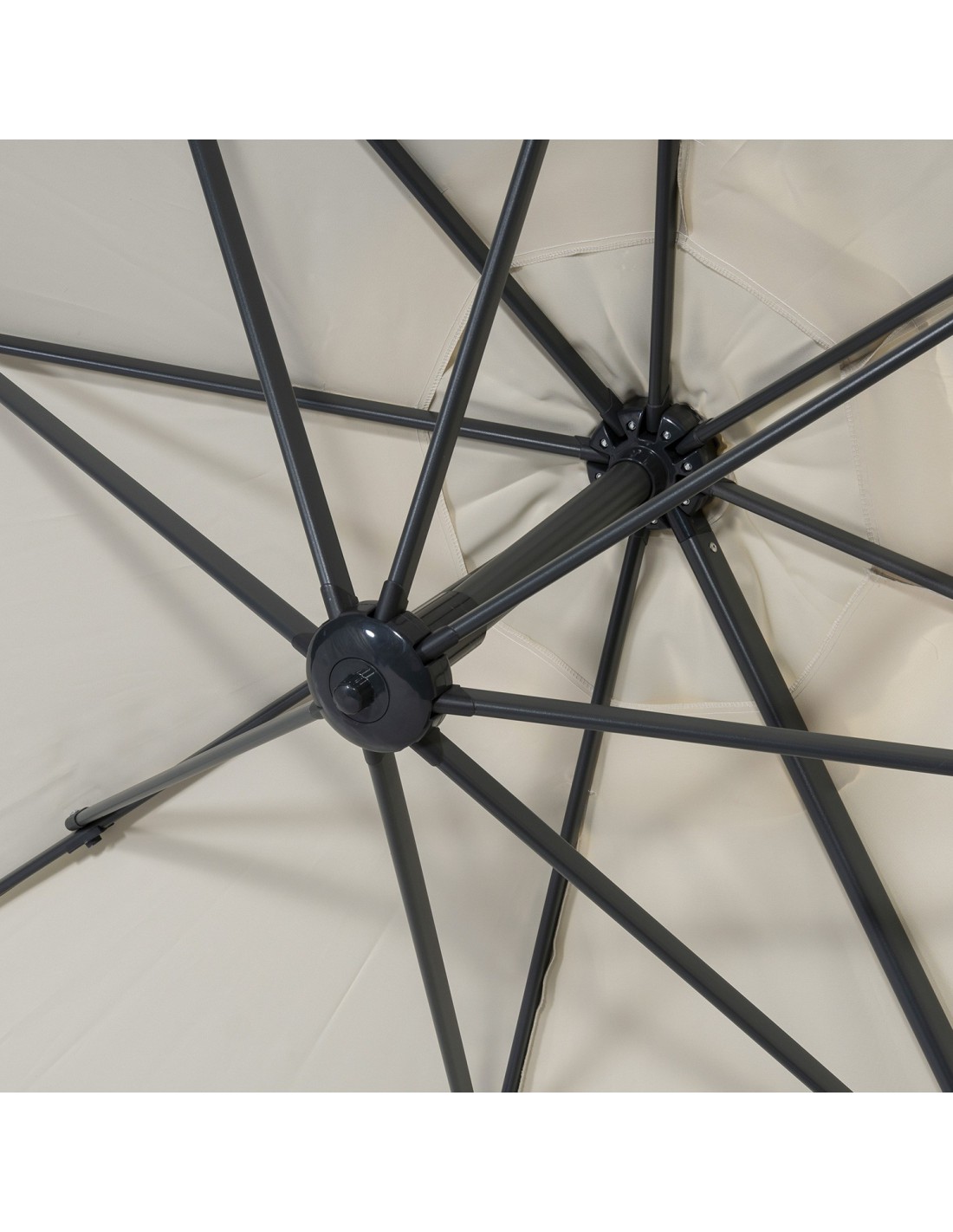 Parasol d'extérieur rond style pendule de 3,5m avec structure inoxydable entièrement en aluminium de couleur gris anthracite. Tissu polyester 200 grammes de couleur beige.