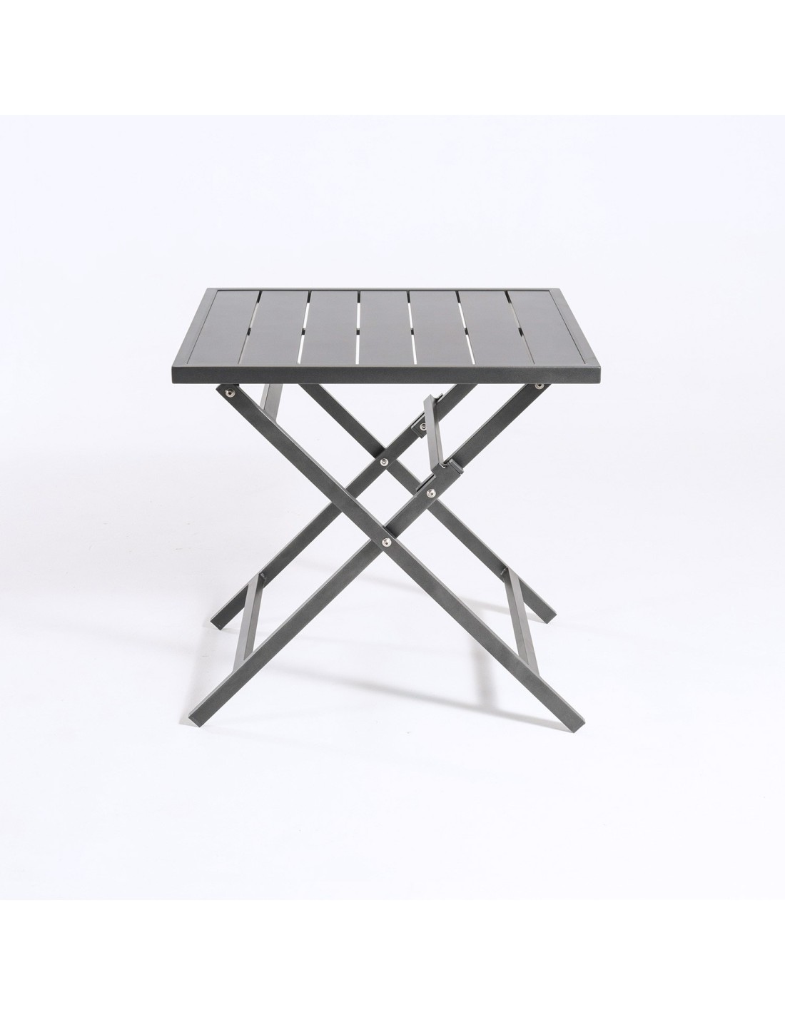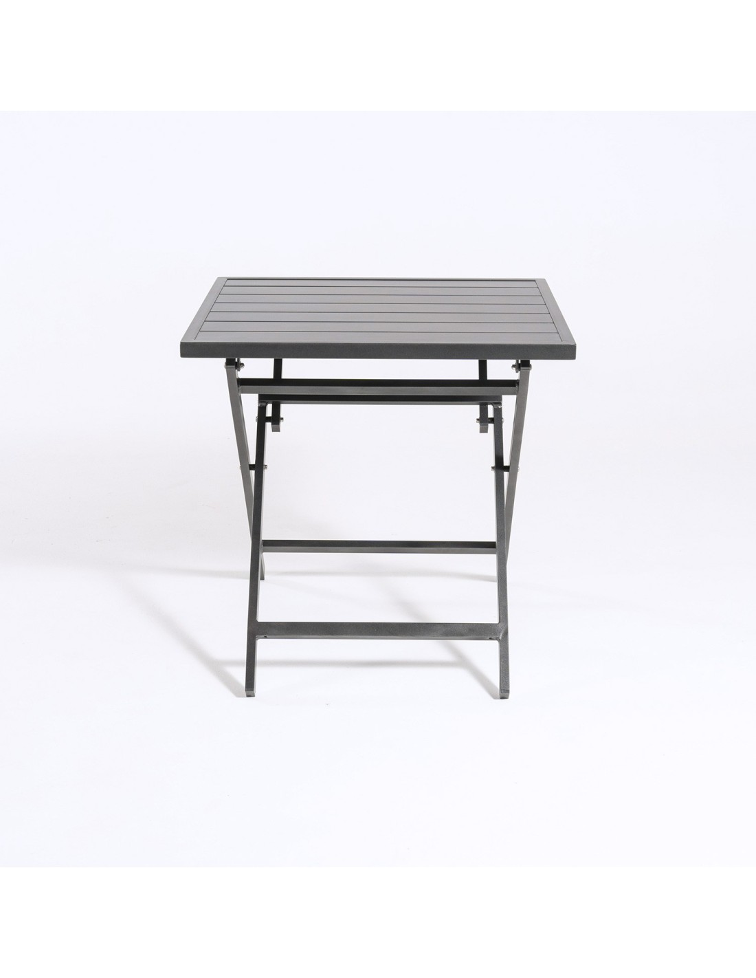 Table d'extérieur carrée avec structure en aluminium de couleur anthracite et plateau également en aluminium.