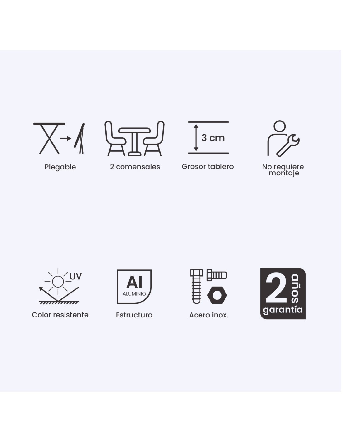 Table idéale pour une utilisation en extérieur, ne nécessite pas d'entretien et pour le nettoyage nous recommandons d'utiliser uniquement un chiffon humide et si nécessaire, du savon neutre.