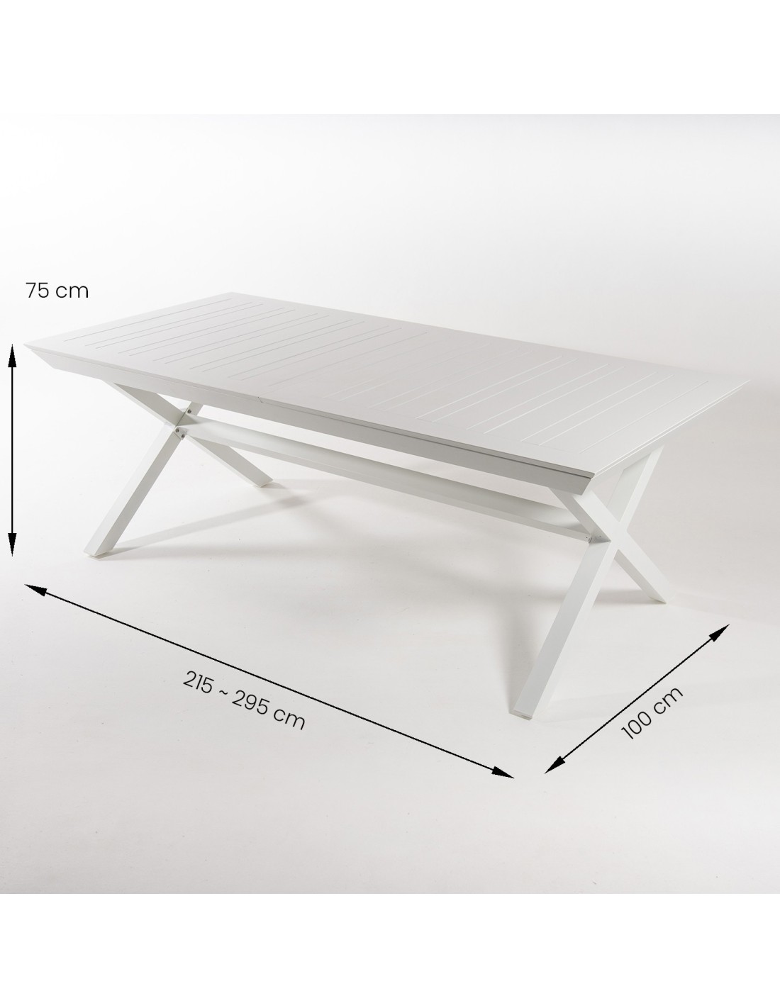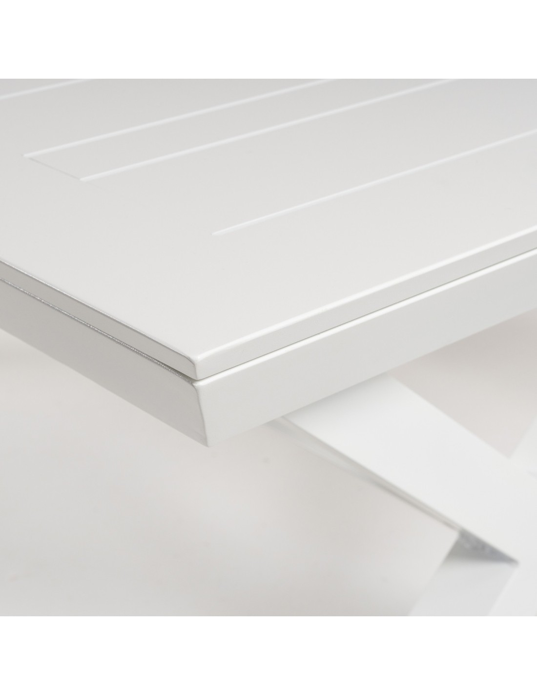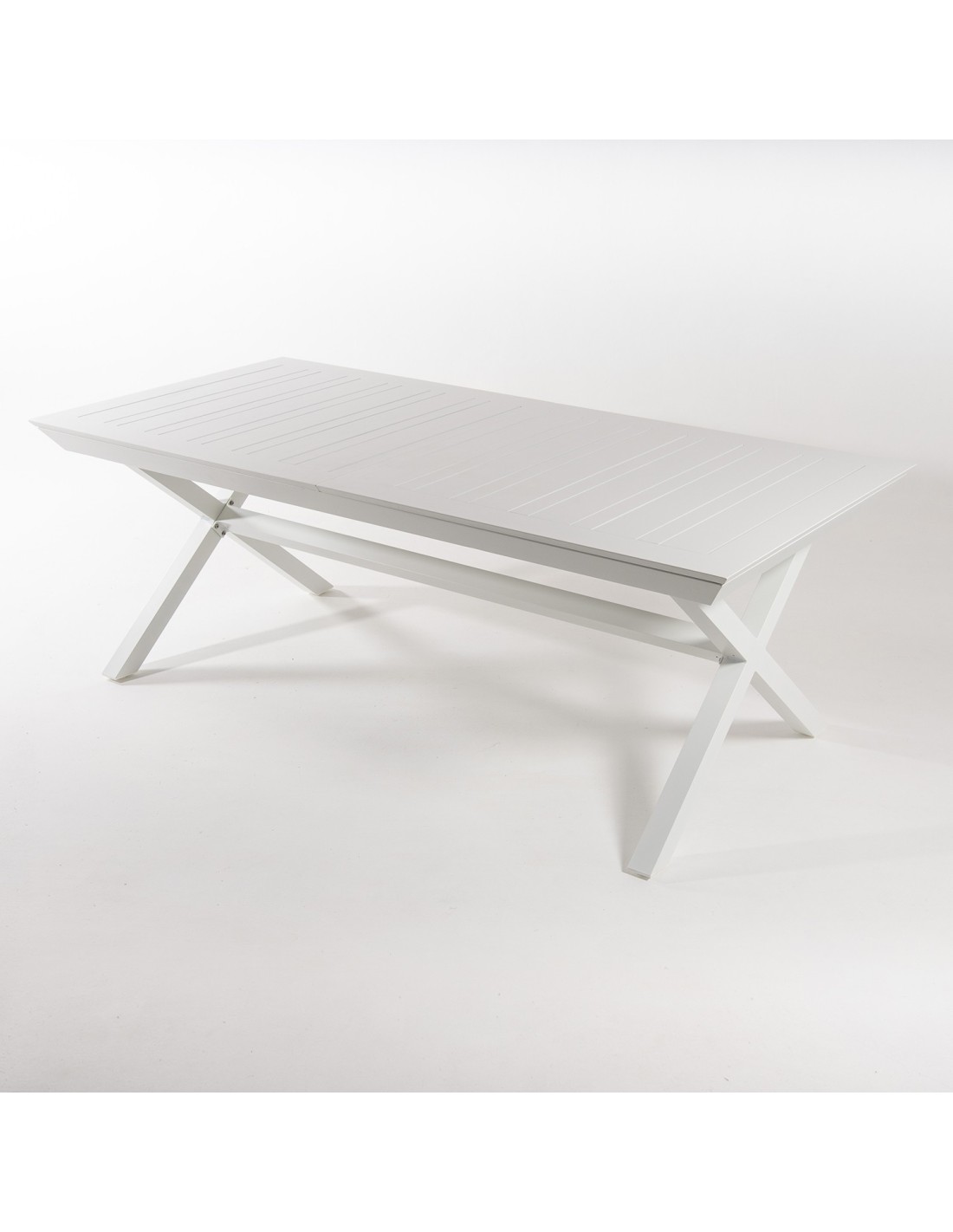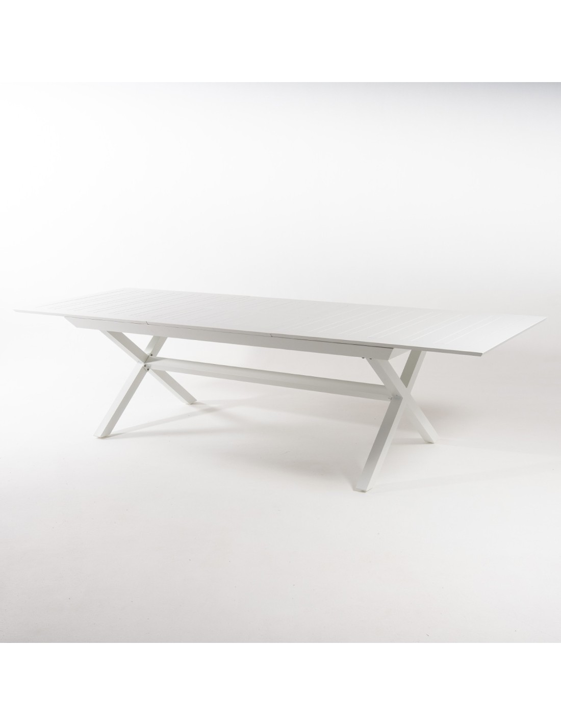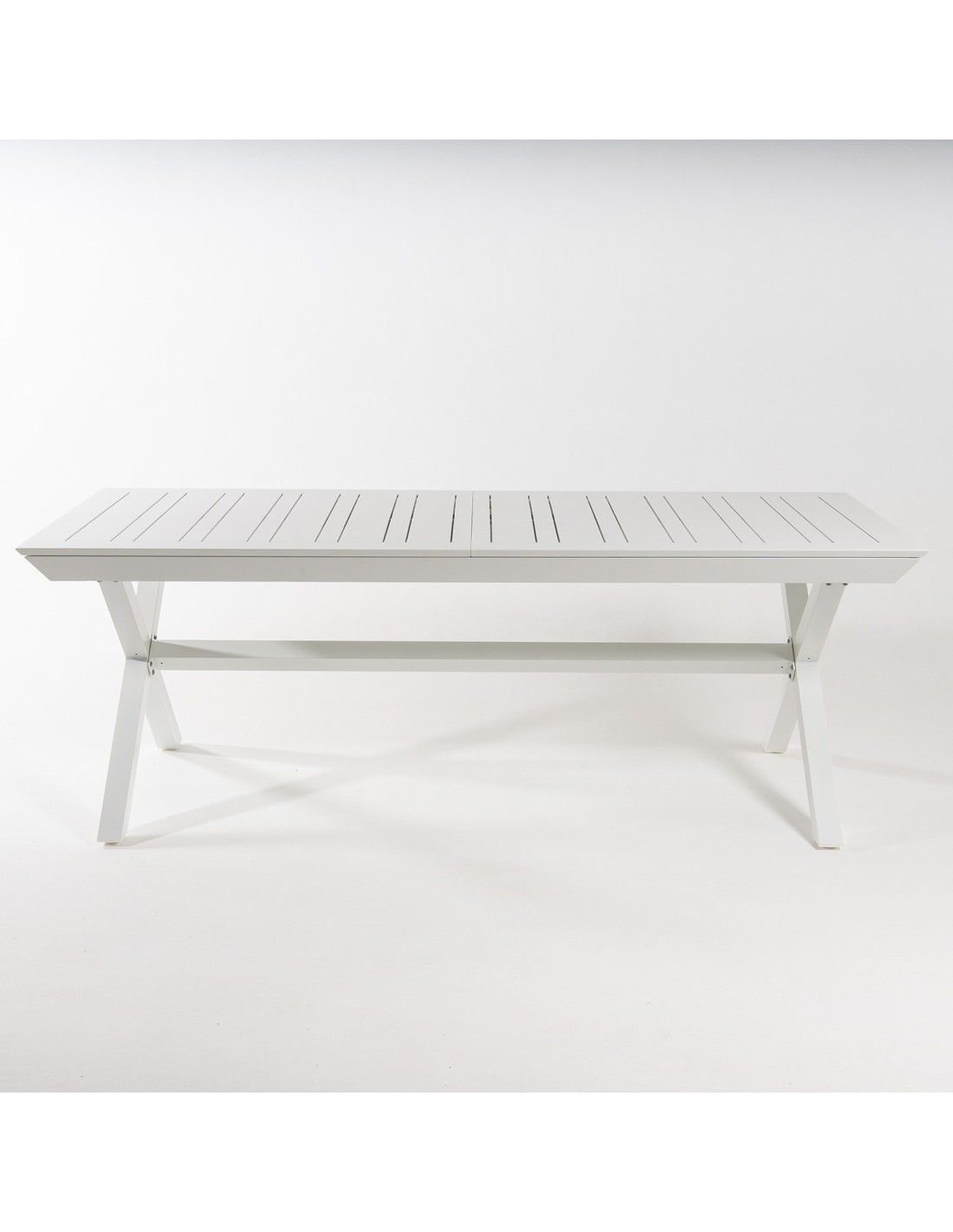 Table d'extérieur en aluminium blanc extensible et pieds croisés, pour donner à cette table une touche différente.