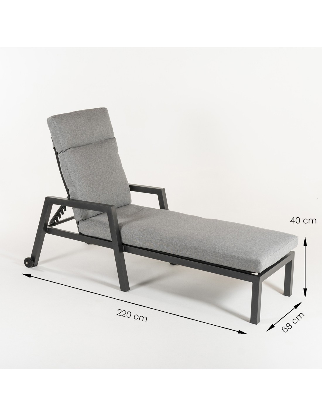 Chaises longues d'extérieur à roulettes réalisées avec leur structure en aluminium de couleur anthracite et coussins gris inclus.