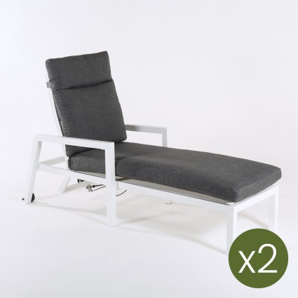 Chaises longues d'extérieur à roulettes réalisées avec leur structure aluminium blanc et coussins gris foncé inclus.