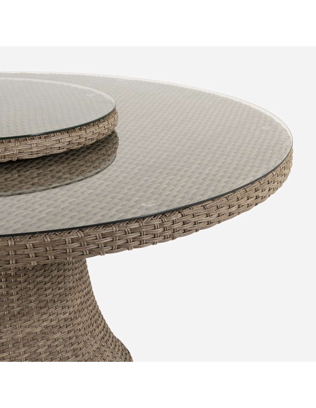 Mesa exterior de 150 cm de diámetro de color natural. Fabricada con su estructura de aluminio y ratán sintético plano de alto gramaje y doble unión.