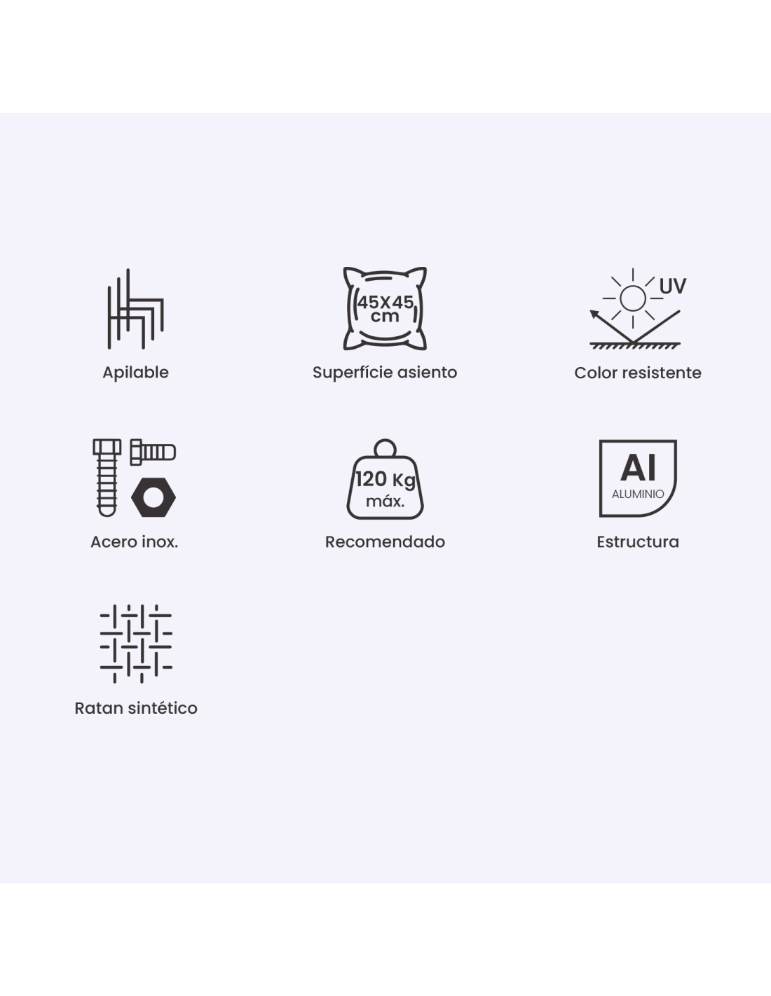El respaldo de éste sillón de jardín es muy curvado, ideal para apoyar bien la espalda y relajarte muy cómodamente, este sillón tiene la posibilidad de apilar hasta 6 sillones de forma fácil y cómoda, en el asiento encontrarás dos agujeros para poder poner las patas de los sillones al apilar.