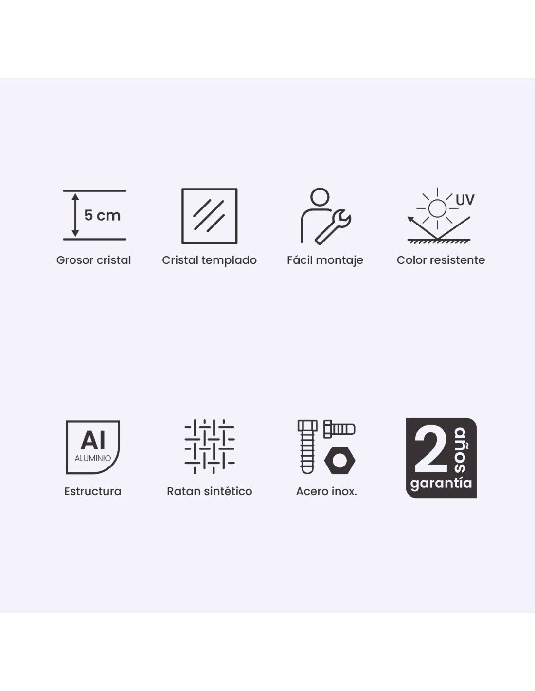 Protección UV y estructura de aluminio reforzada y gruesa, que nos aporta unos muebles de exterior fuertes, duraderos y resistentes.