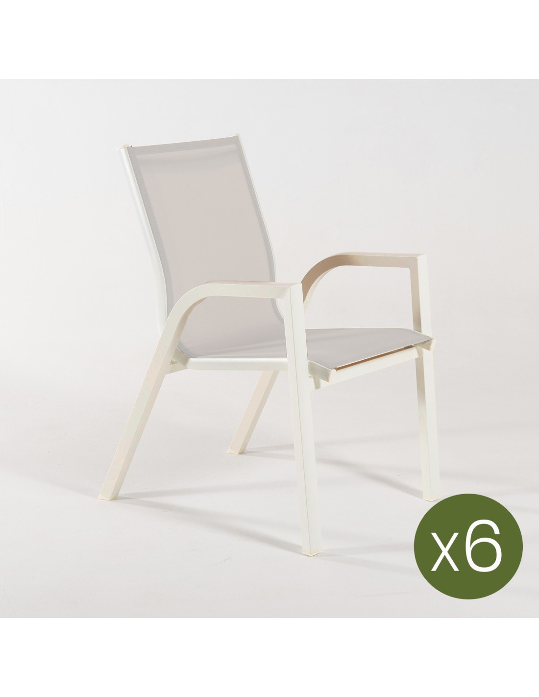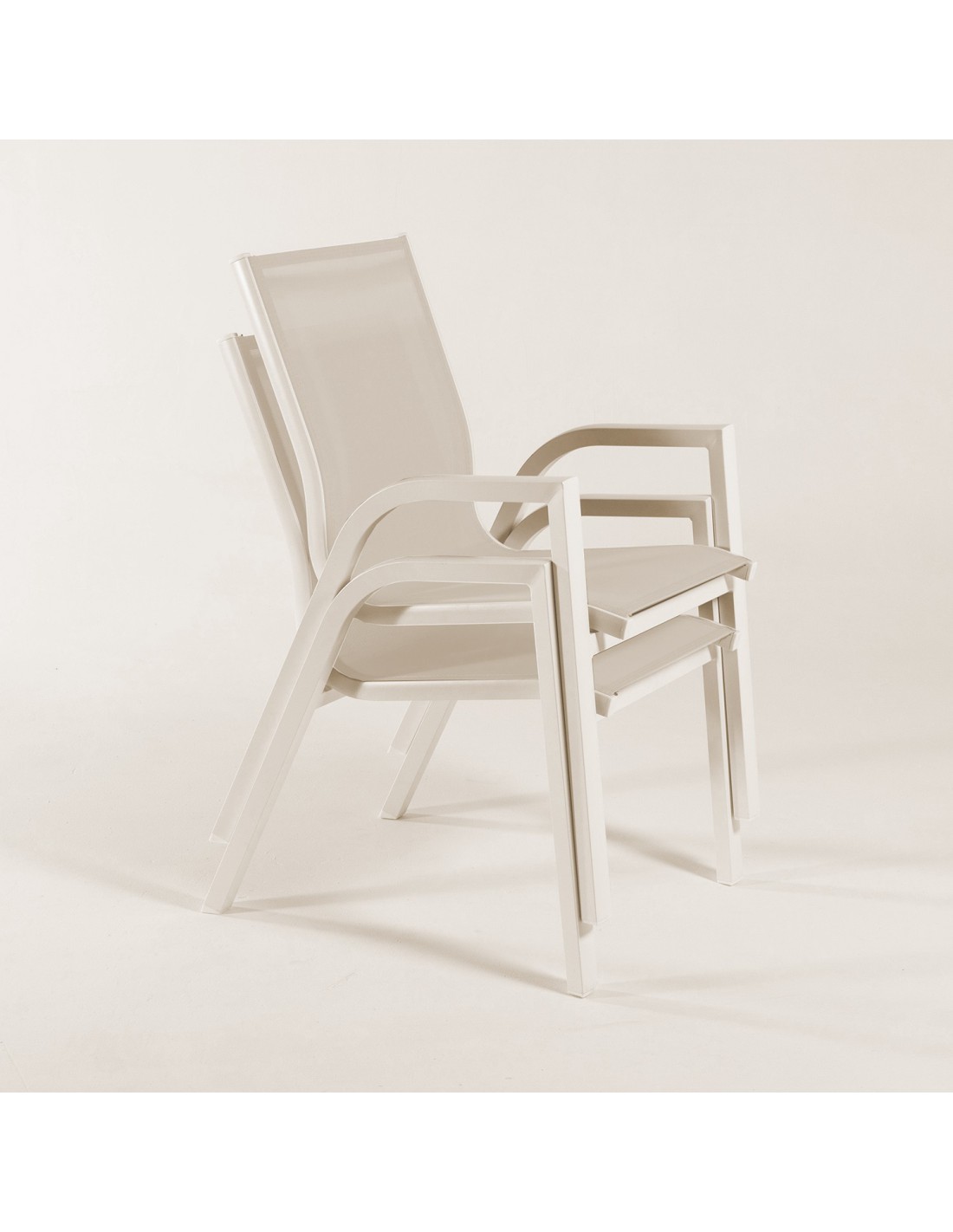 Graças à sua estrutura de alumínio em tecido off-white e textilene off-white, as cadeiras são empilháveis para economizar espaço quando você não precisa delas.
