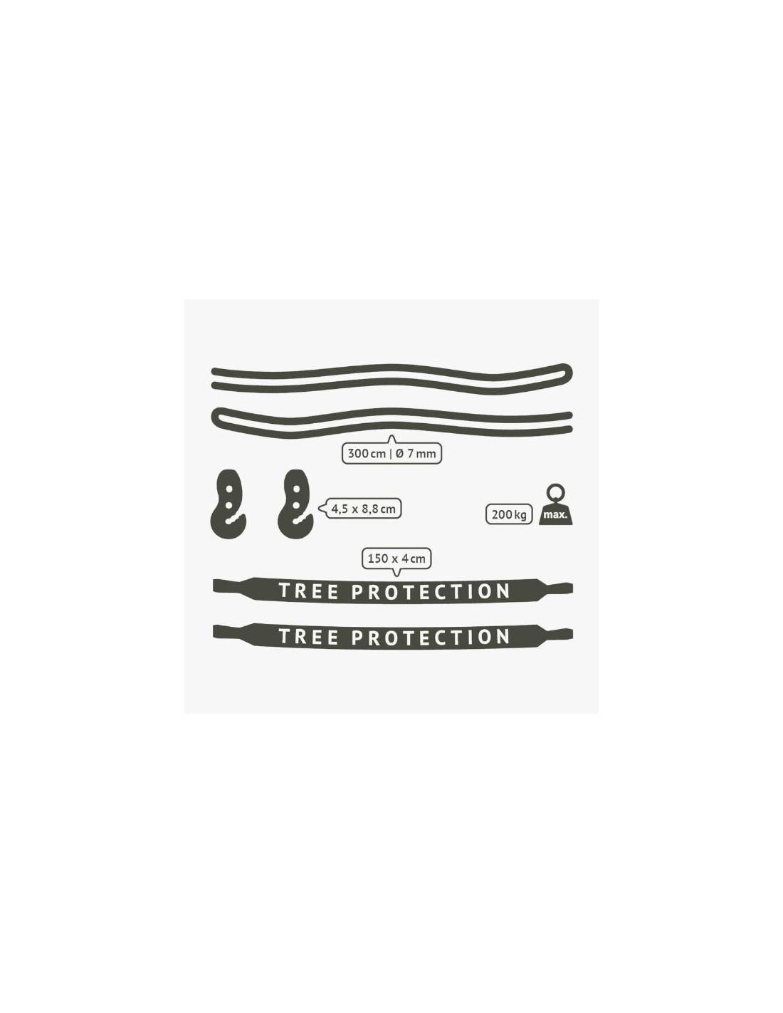 O conjunto inclui dois ganchos reforçados, duas cordas 100% poliéster de 300 cm de comprimento e duas alças para ajustar os 150 cm* Árvore ou poste de 4 cm de largura