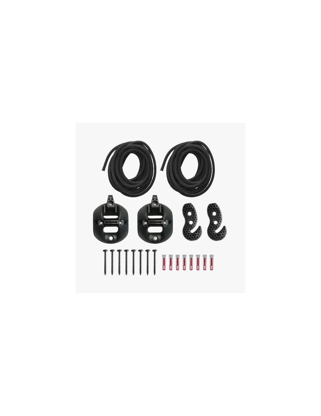 O conjunto inclui dois ganchos reforçados, duas cordas 100% poliéster de 300 cm de comprimento, 8 parafusos para fixar os dois suportes de parede