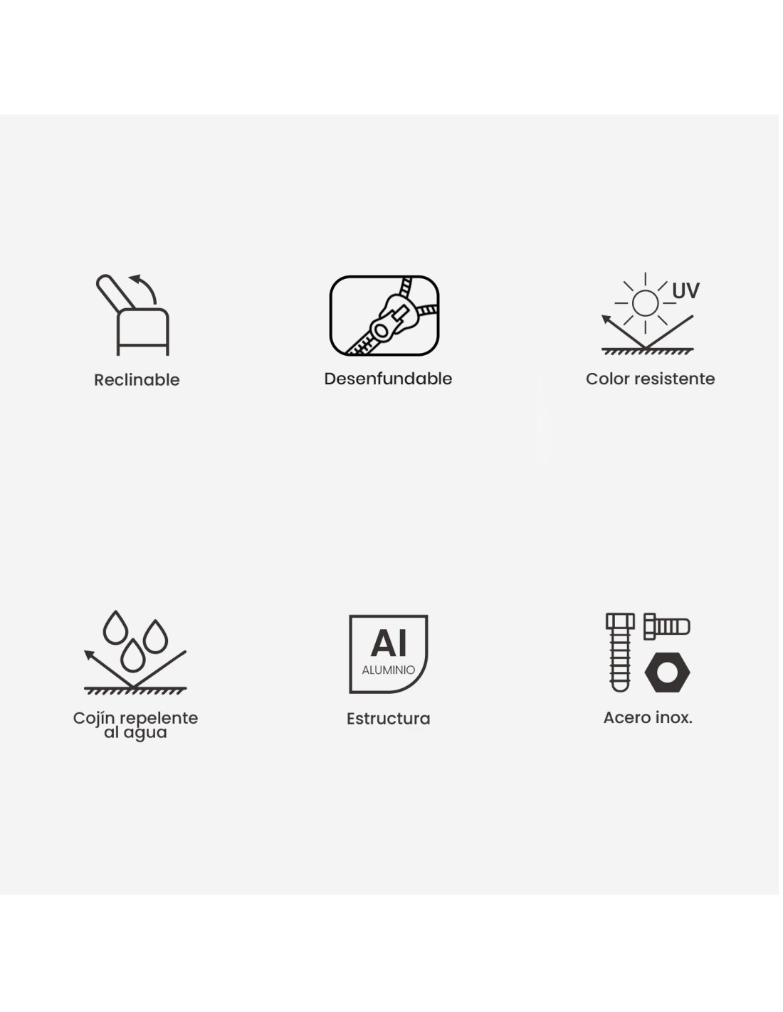 Almofadas cinzentas fabricadas com materiais muito resistentes. São hidrófugos, graças ao seu tecido hidrófugo que não deixa passar a humidade e evita fugas, evitando fungos e manchas negras. As almofadas são removíveis para facilitar a limpeza.