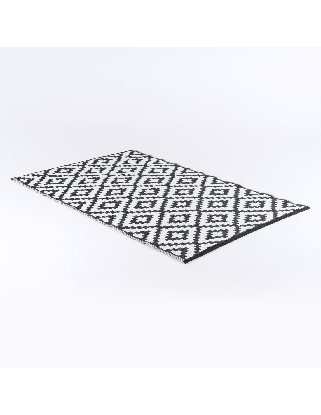 Tapete exterior retangular em preto e branco. Mede 120 x 180 cm (largura x comprimento) Feito com canudos plásticos reciclados. Durável, reciclável e reversível.