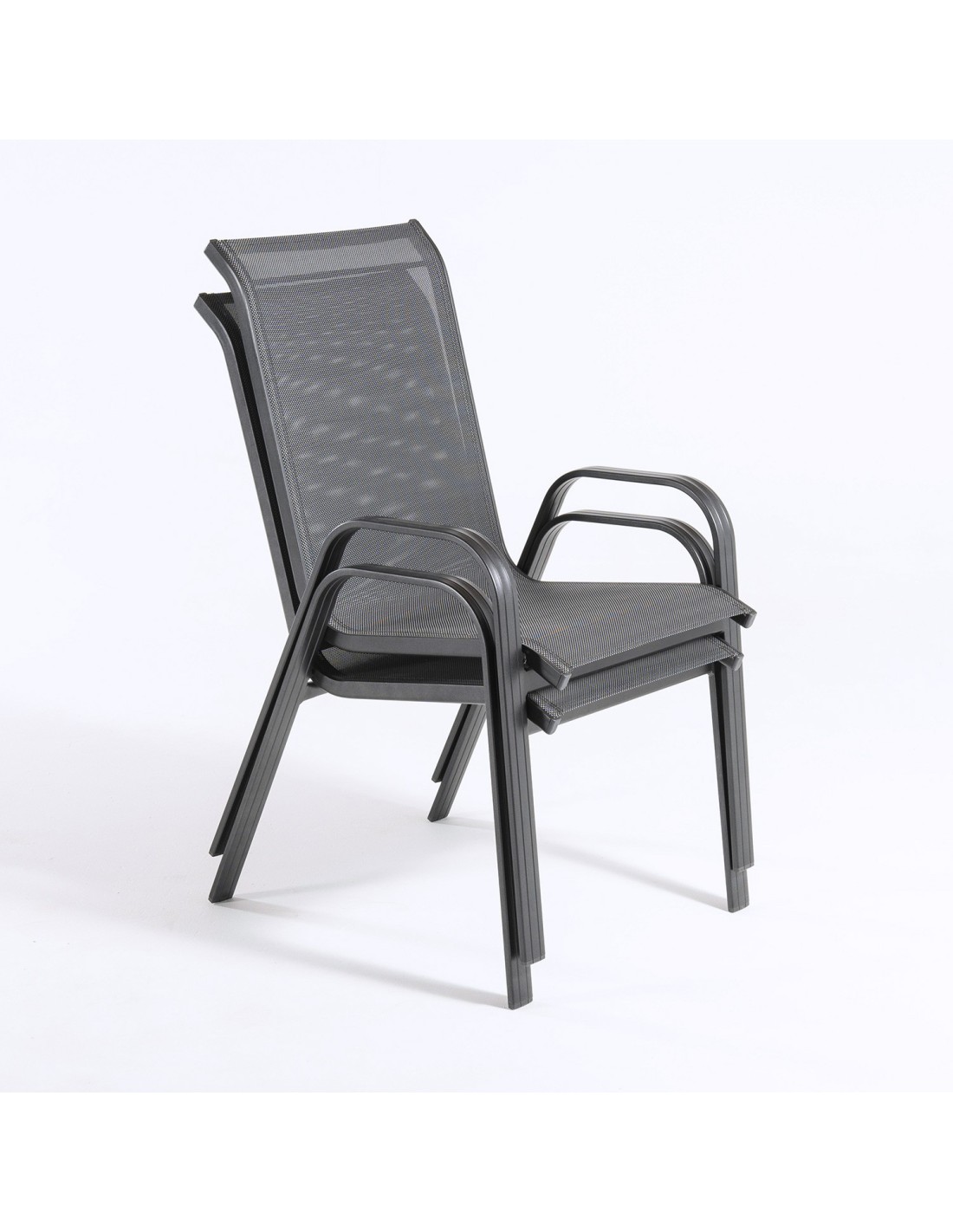 Sillón para jardín con estructura de aluminio en color antracita y textilene combinado en color plata y negro. Apilable con facilidad, podrás apilar hasta 8 sillones para ahorrar espacio cuándo no los necesites con medidas de 57x74x96.5cm.