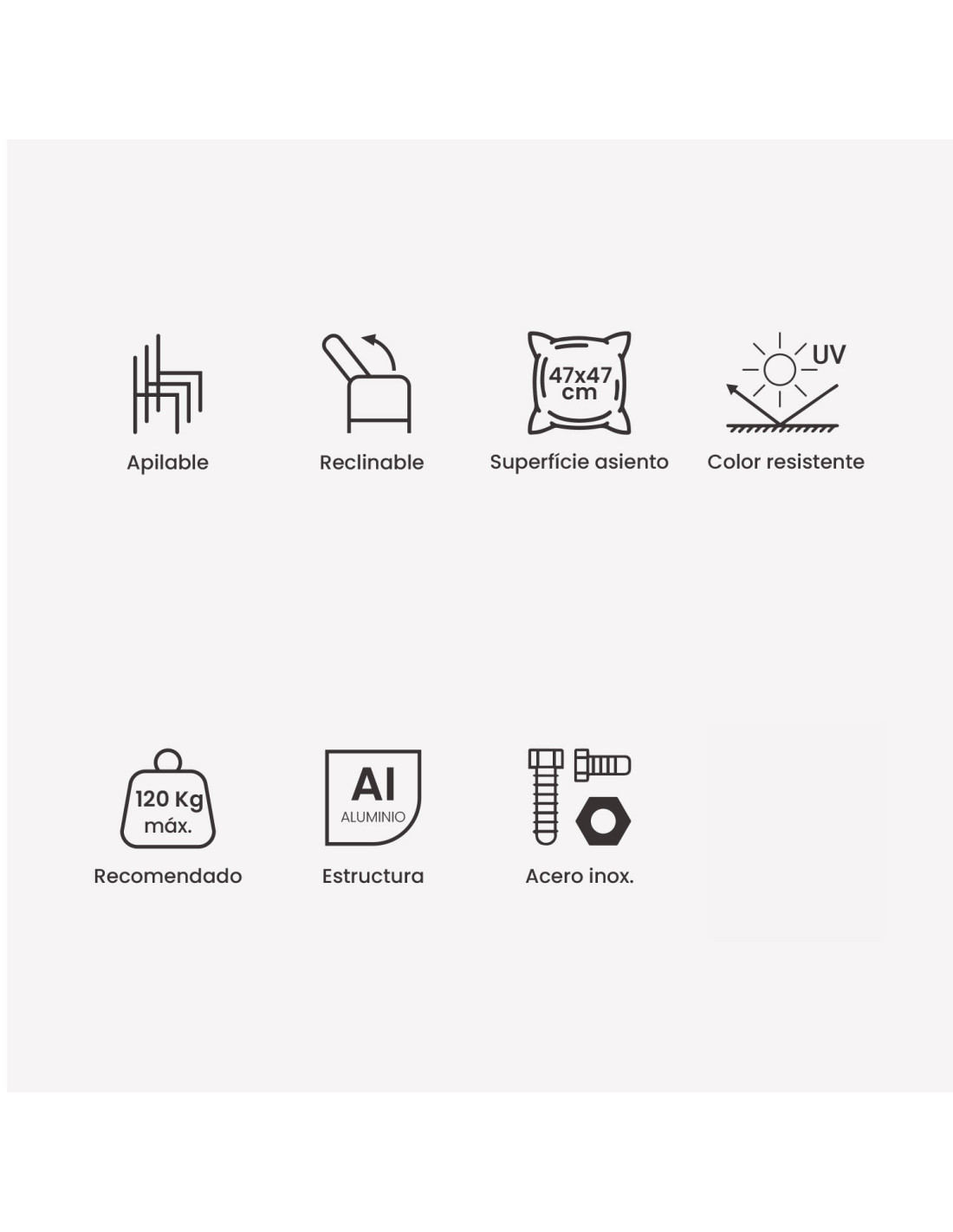 Gracias a su estructura de aluminio en color blanco roto y tejido textilene blanco roto hacen que las sillas sean ideales para poder usar con amigos, familiares o en cada ocasión que sea necesaría.
