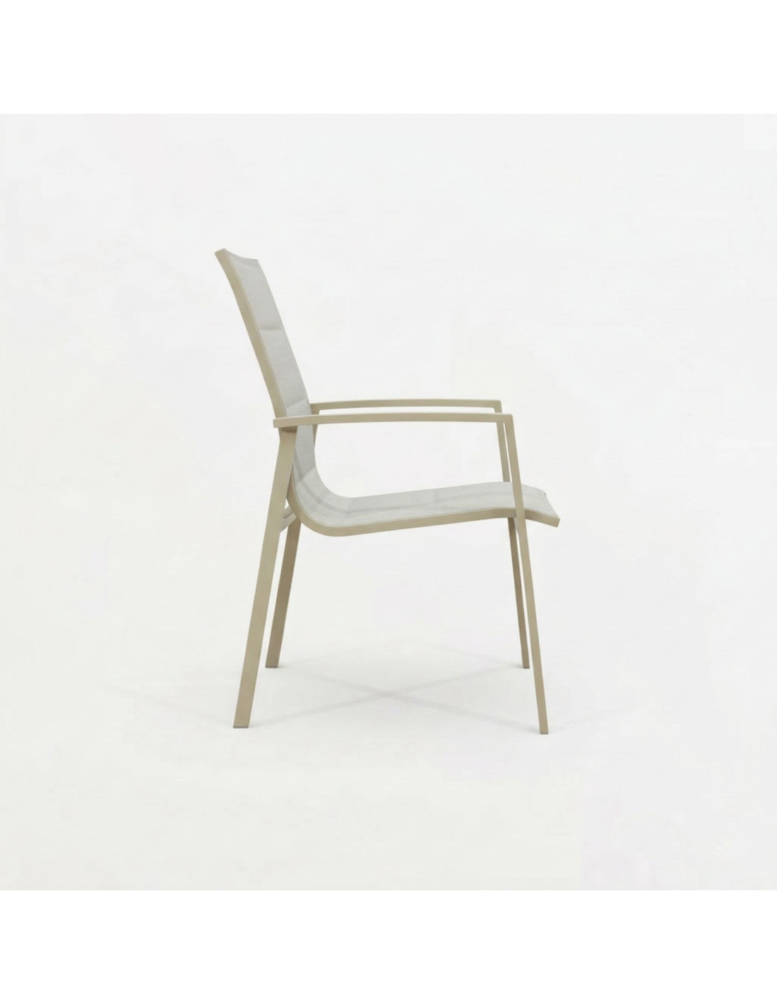 Cada sillón está fabricado con una robusta estructura de aluminio en color blanco roto y un tejido textilene en un atractivo tono beige, creando una combinación equilibrada entre estética y funcionalidad.