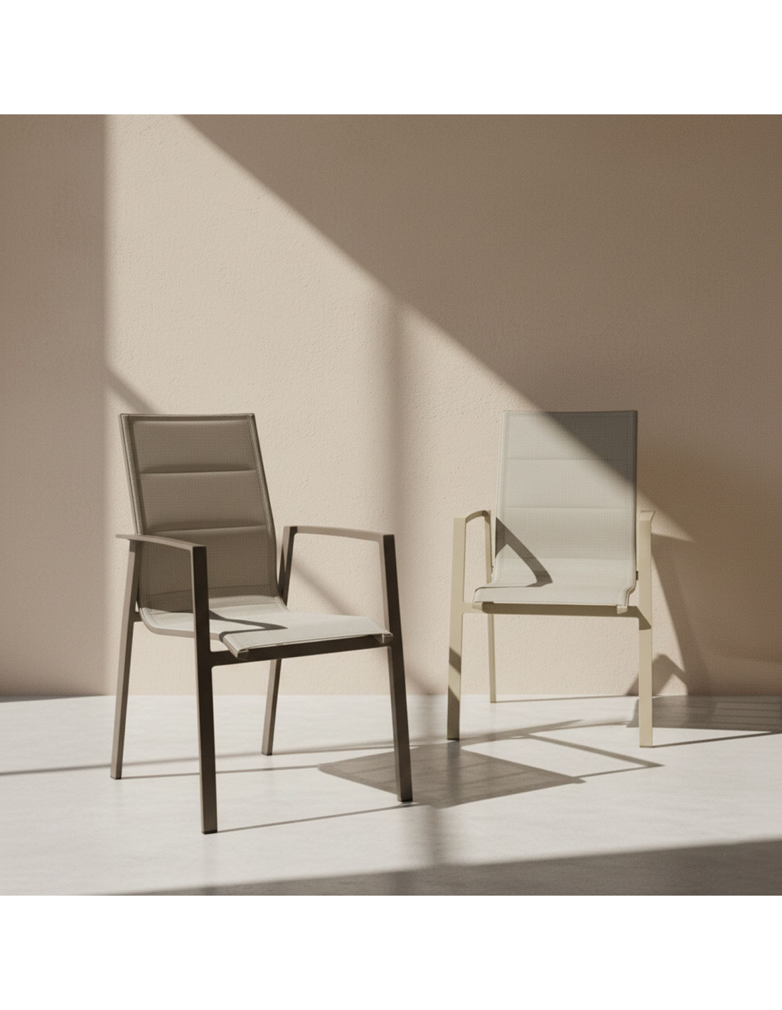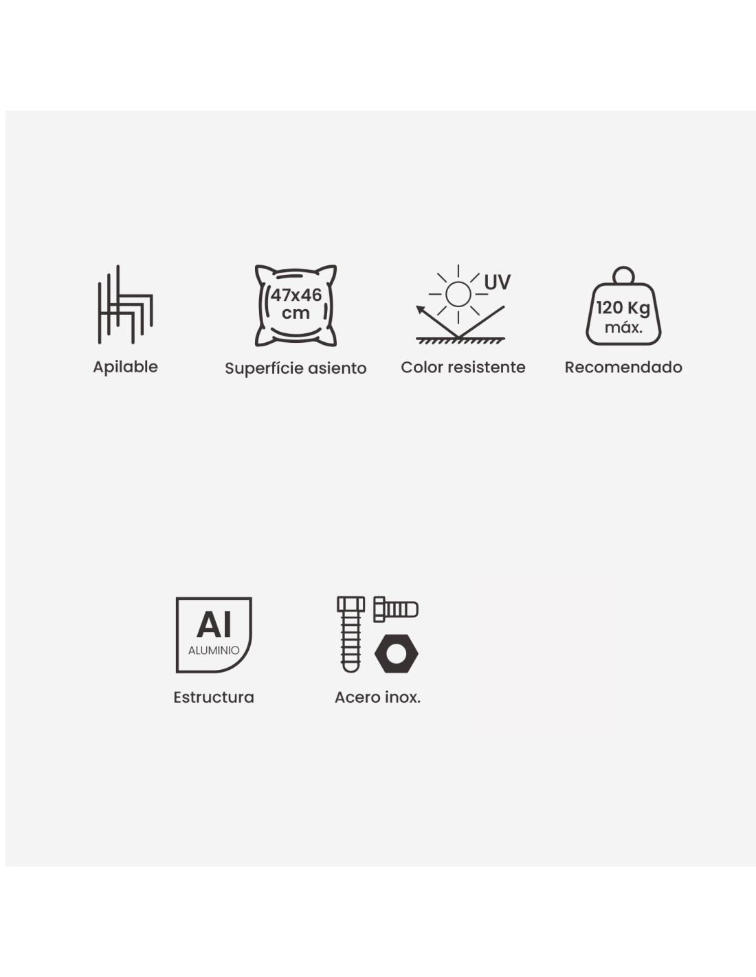 La estructura de aluminio reforzado, con un grosor superior, aporta una gran estabilidad y convierte estos sillones en una opción duradera y robusta. Además, al ser un material ligero y resistente a la humedad, resulta ideal para mobiliario expuesto diariamente a la intemperie.