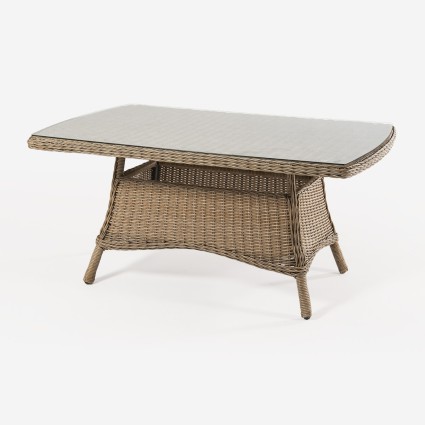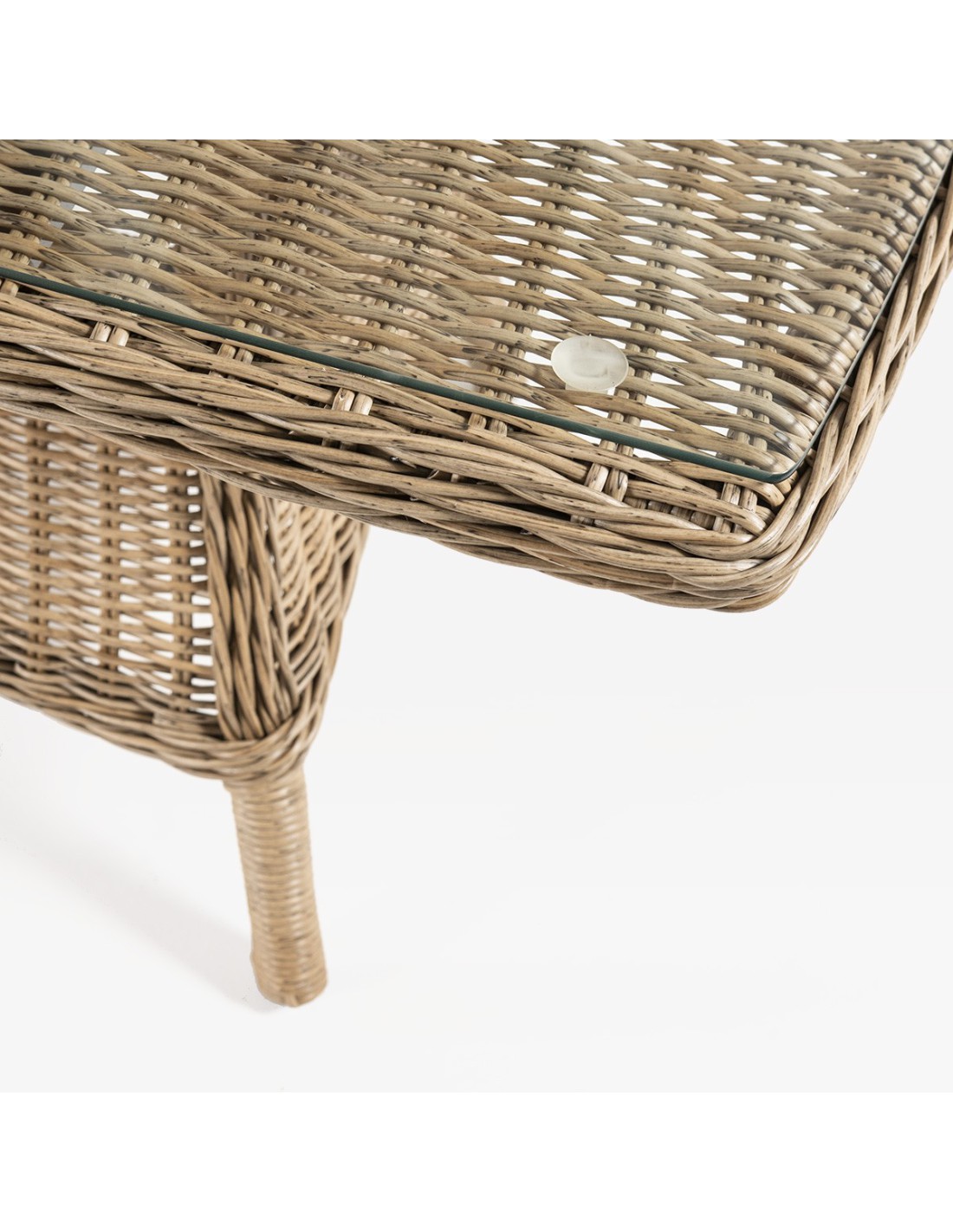 Mesa de centro para jardín fabricada con estructura de aluminio y ratán sintético redondo, en color natural.