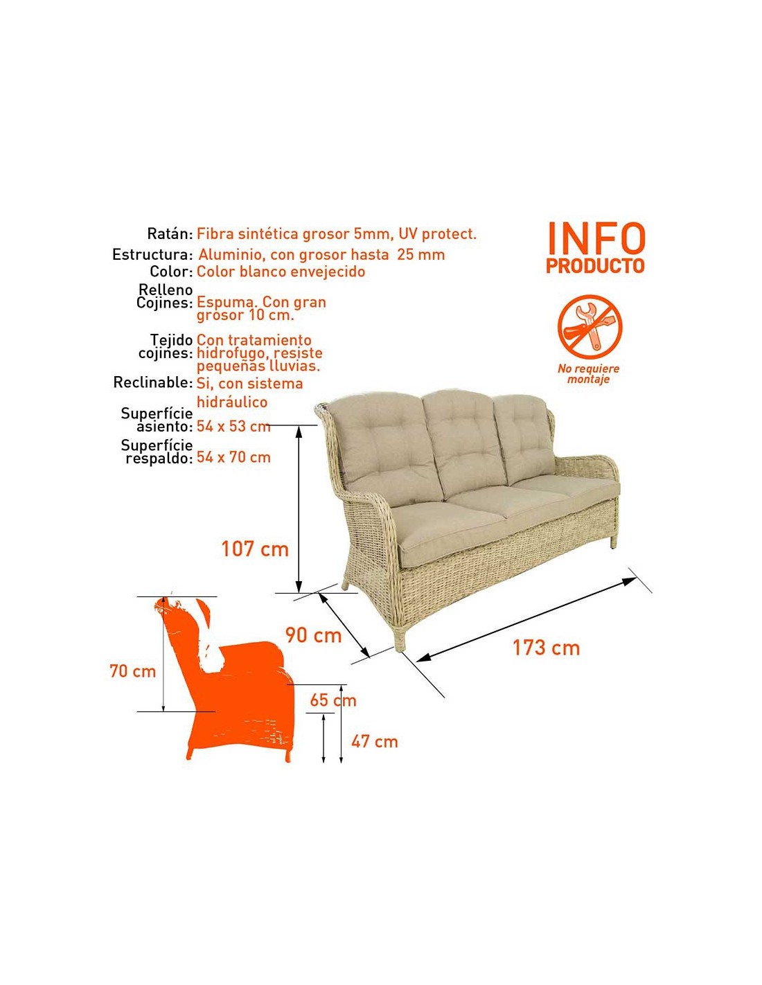 Este sofá de jardim não necessita de qualquer tipo de manutenção, recomendamos a sua limpeza com um pano húmido e, se necessário, com sabão neutro.