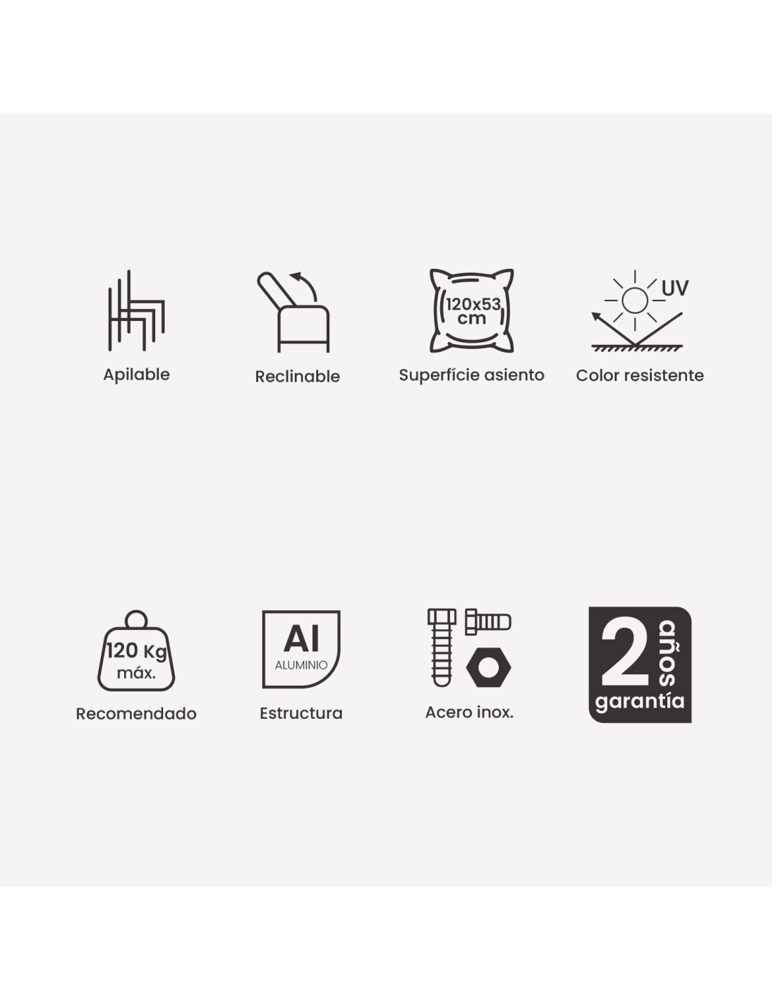 La estructura es de aluminio reforzado de gran grosor, para conseguir unos muebles fuertes y duraderos. Las uniones se realizan con la misma estructura de aluminio debidamente fortalecido. También, el aluminio es un material ligero y con gran resistencia a la intemperie que no es afectado nocivamente por el agua o la humedad, un material muy adecuado para estar al aire libre.